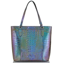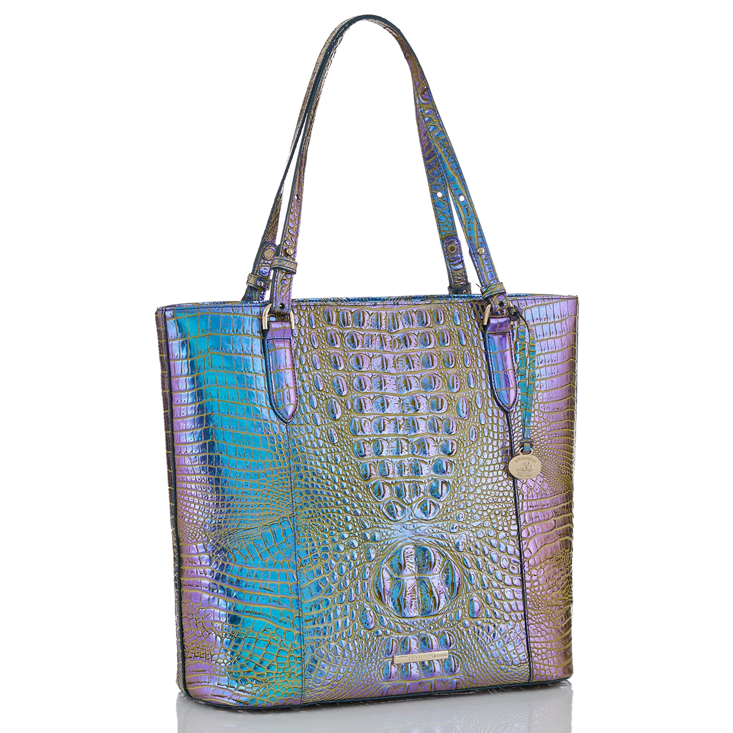Featured in Illuminate Melbourne, a radiant all-over metallic that brings eye-catching radiance to your seasonal style. This electric color combo brings together lime green, cyan blue, and vibrant violet. Made with genuine croc-embossed leather.