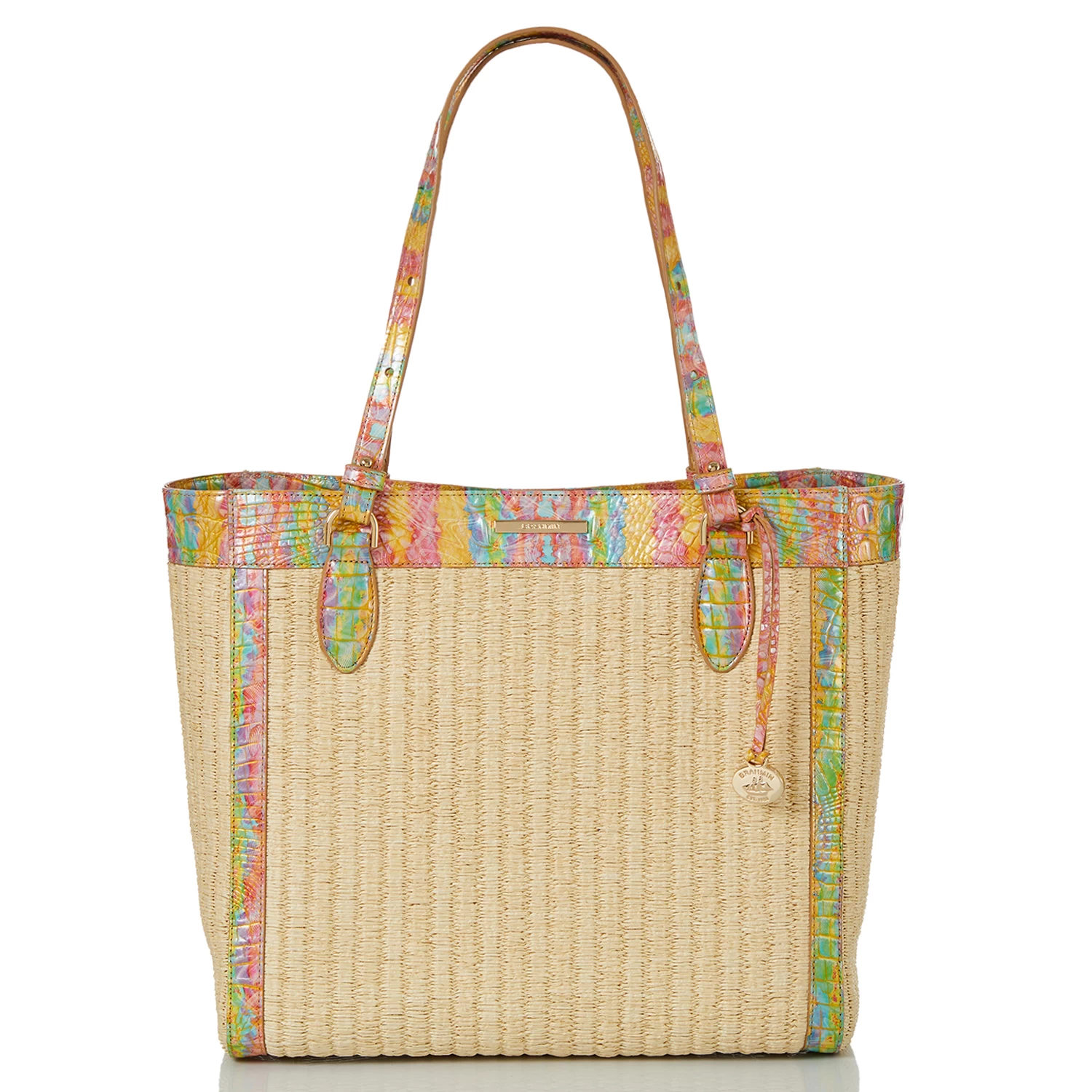Featured in Saltwater Taffy Bungalow, a luxe lightweight collection for warmer weather. Made with Italian straw this gets a colorful, playful pop with hints of our Saltwater Taffy Melbourne. Select styles also feature bambooo hardware that adds a special touch. Made with genuine leather.