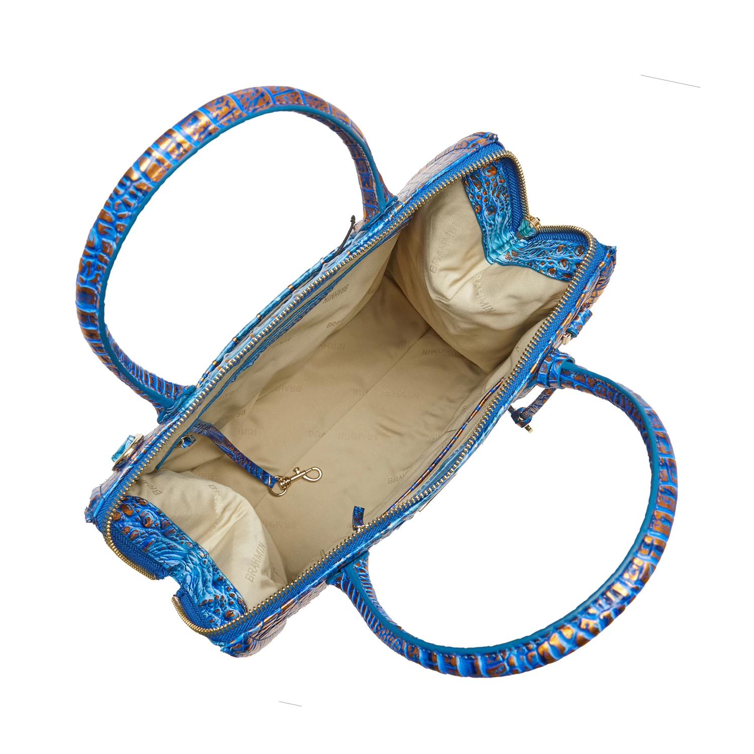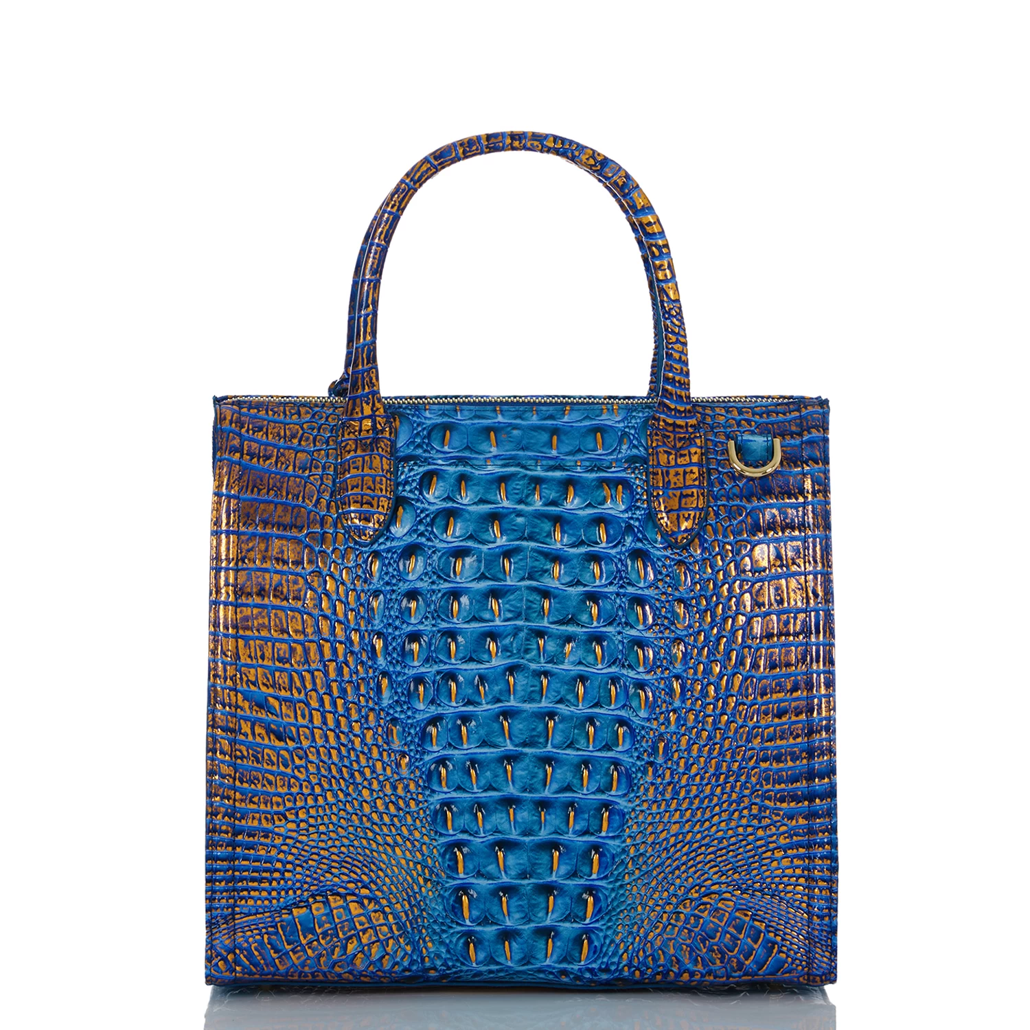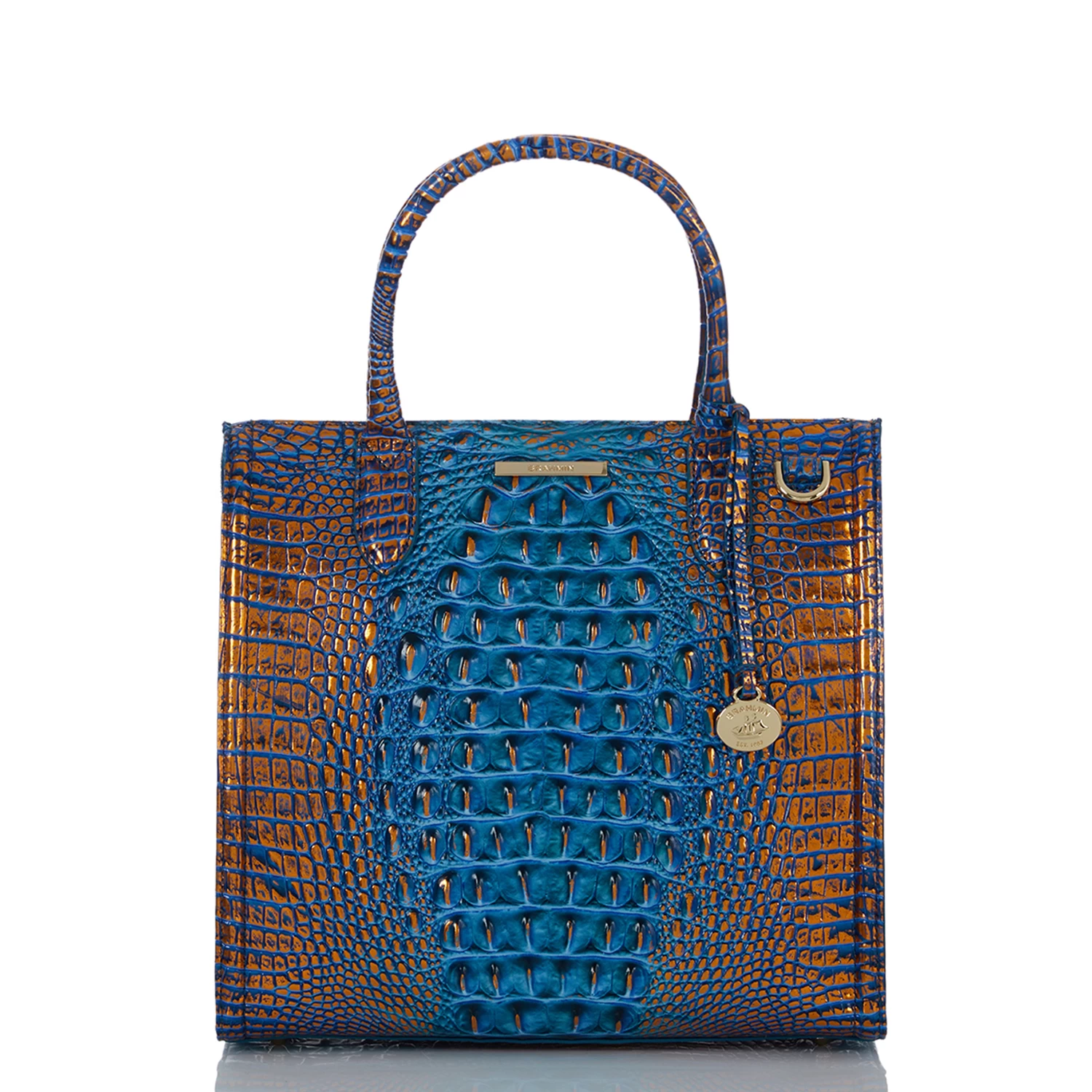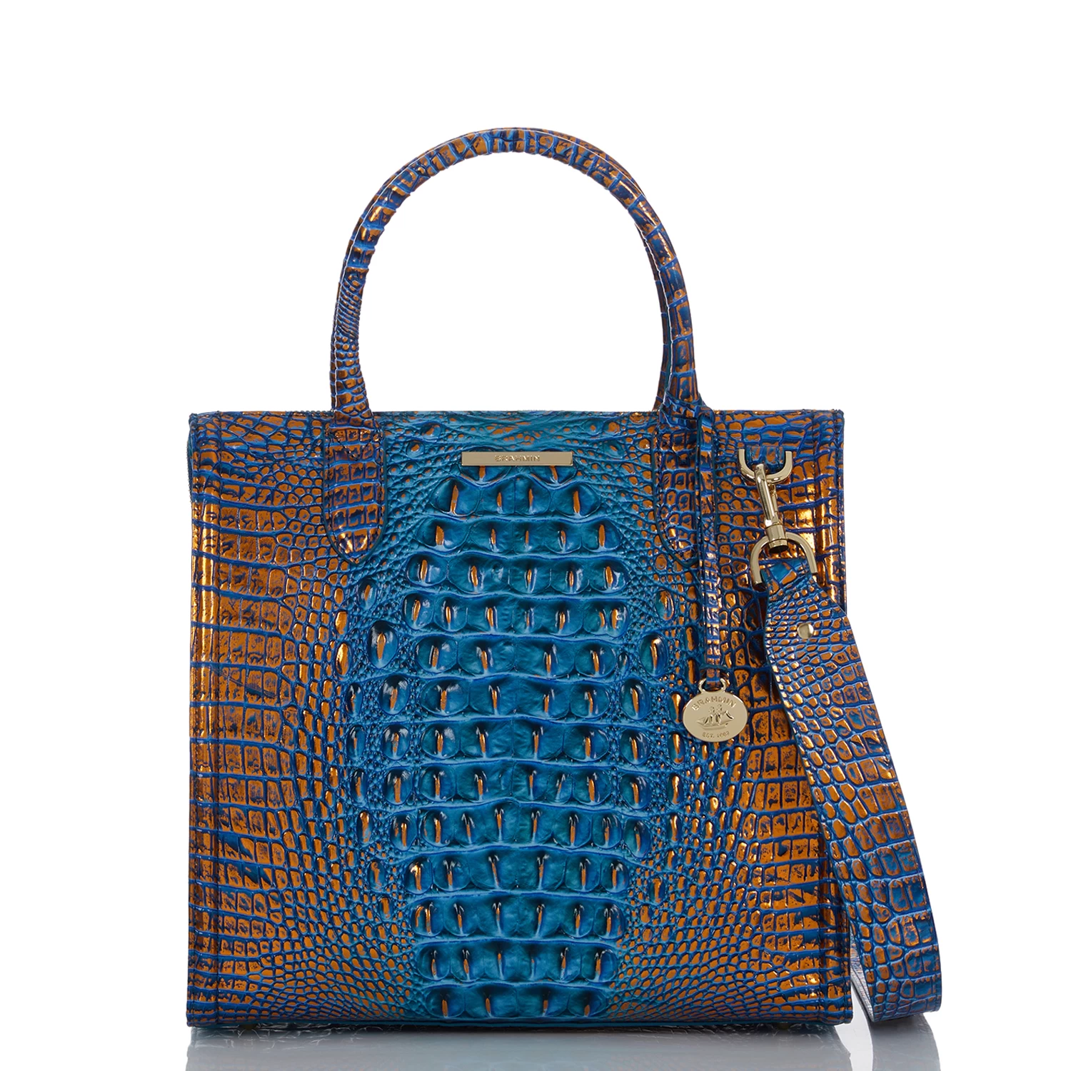 Featured in Deep Azure Melbourne, a saturated, dynamic blue. This deep, dazzling blue is accented with a copper metallic shimmer that brings eye-catching shine to warmer weather. Made with genuine croc-embossed leather.