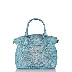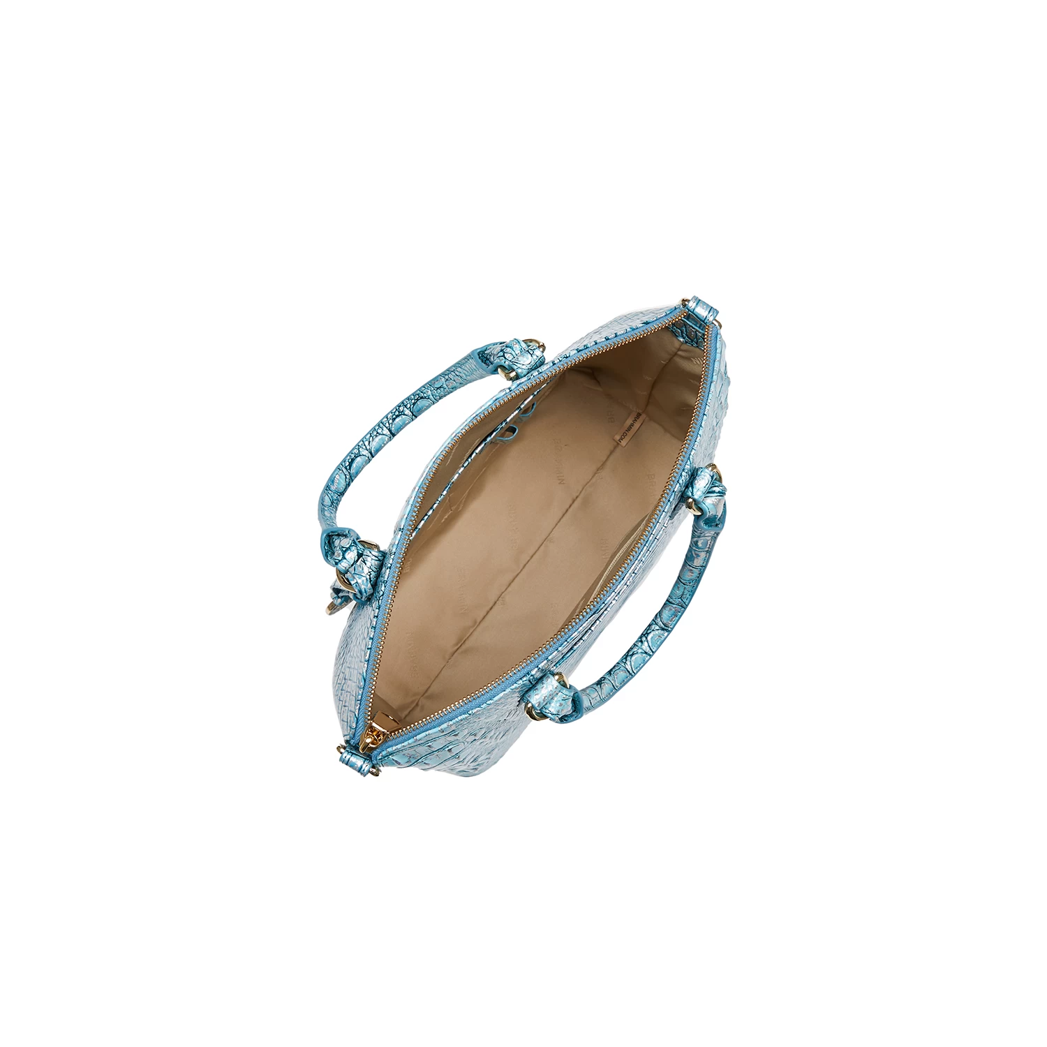 Featured in Arctic Blue Melbourne, an effervescent pale blue that will add some sparkle to your season. The light blue base transitions into a rich, darker variation and is accented with metallic silver tipping for added elevation. The irresistible iridescence lends luxury to any look (perfect for the season of celebrating). Made with genuine croc-embossed leather.