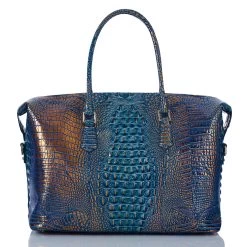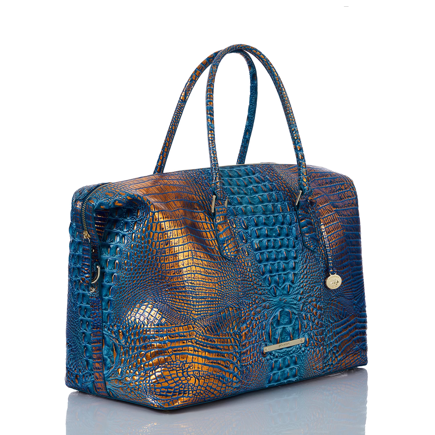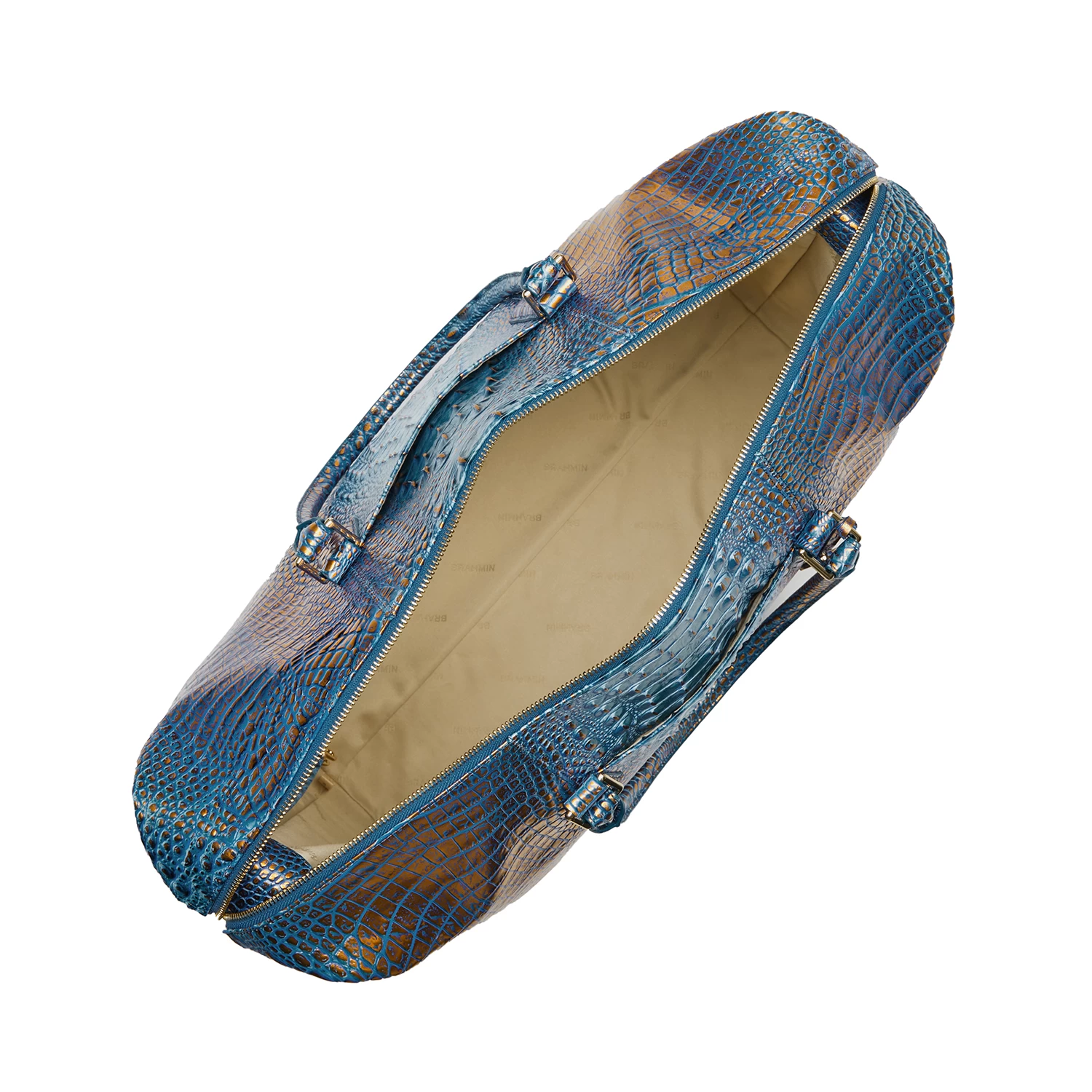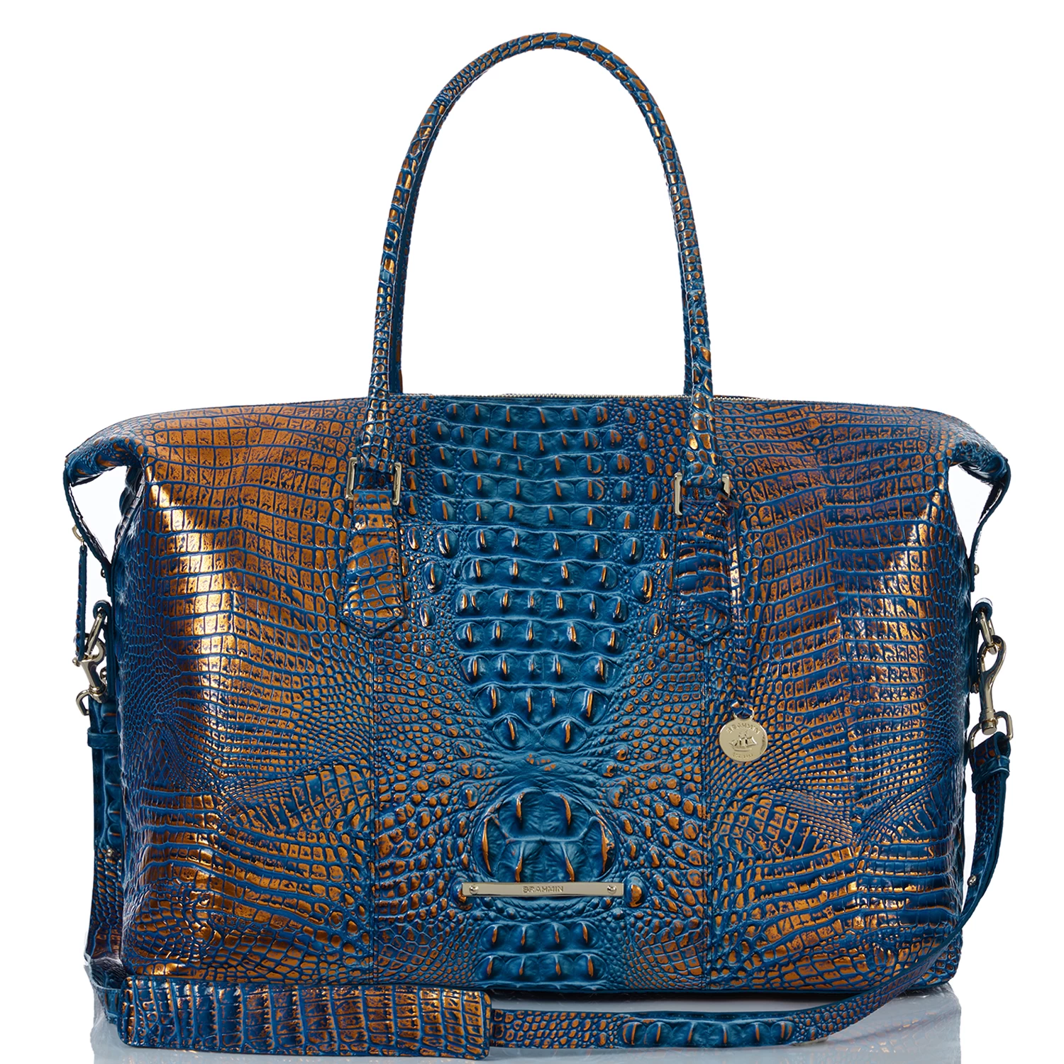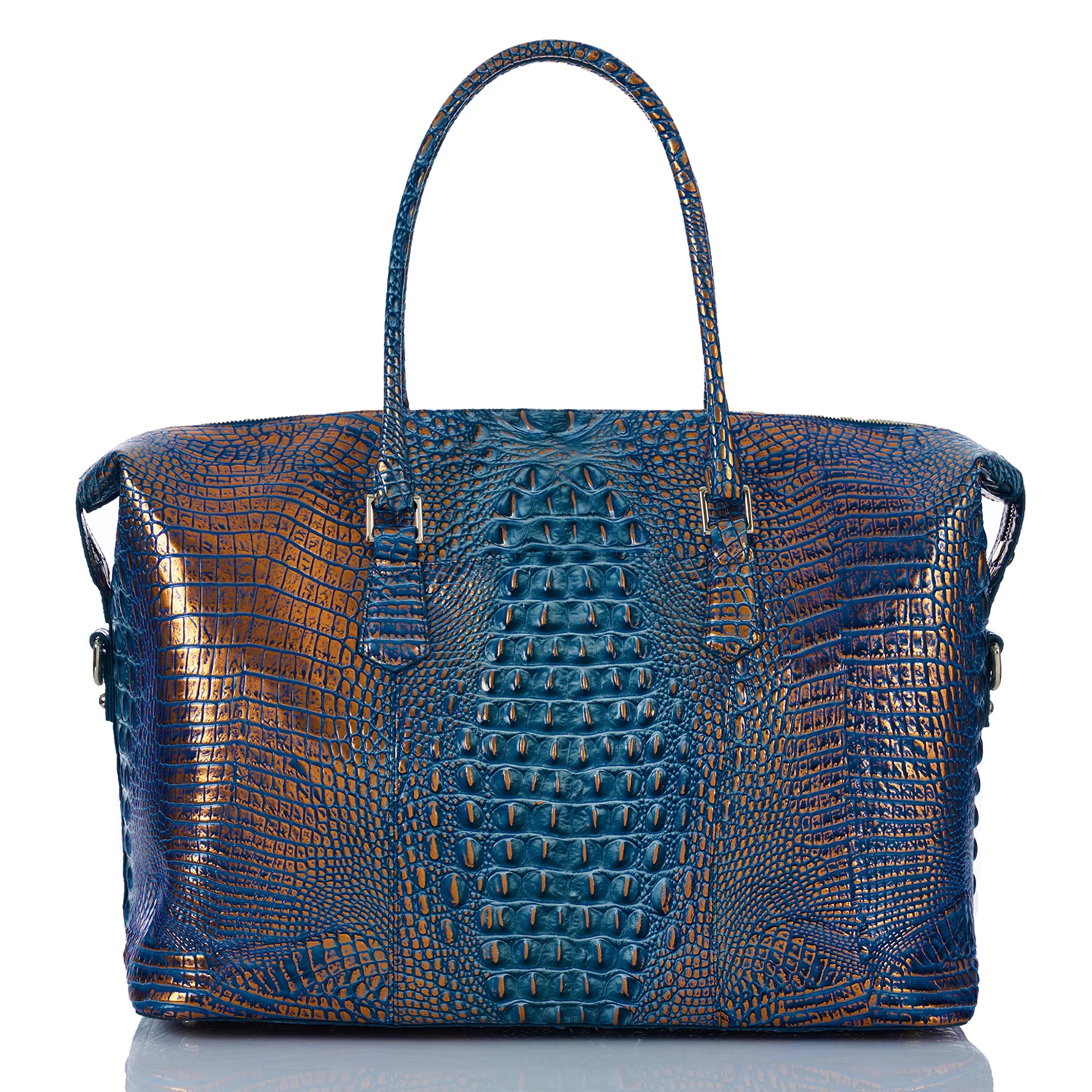 Featured in Deep Azure Melbourne, a saturated, dynamic blue. This deep, dazzling blue is accented with a copper metallic shimmer that brings eye-catching shine to warmer weather. Made with genuine croc-embossed leather.