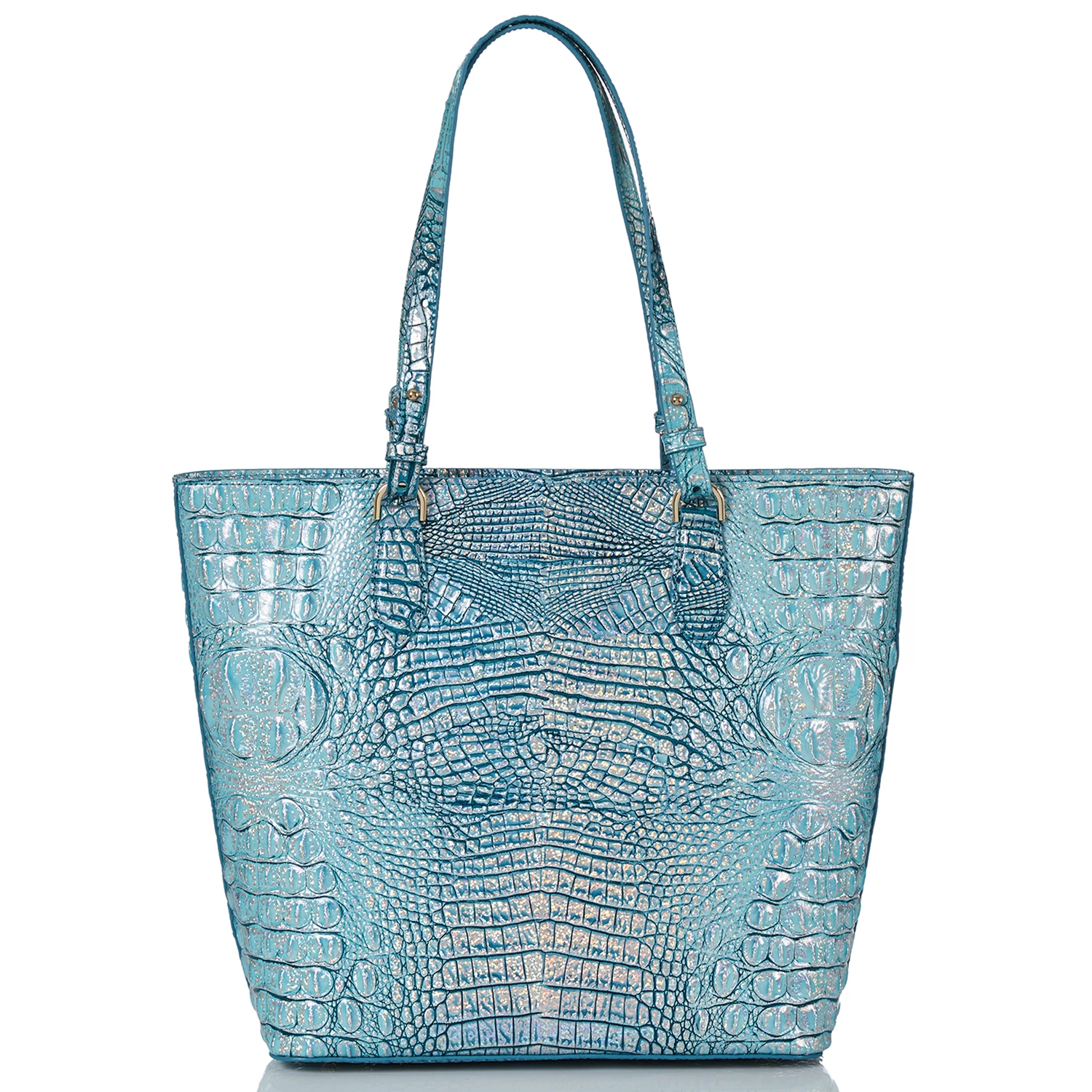 Featured in Arctic Blue Melbourne, an effervescent pale blue that will add some sparkle to your season. The light blue base transitions into a rich, darker variation and is accented with metallic silver tipping for added elevation. The irresistible iridescence lends luxury to any look (perfect for the season of celebrating). Made with genuine croc-embossed leather.
