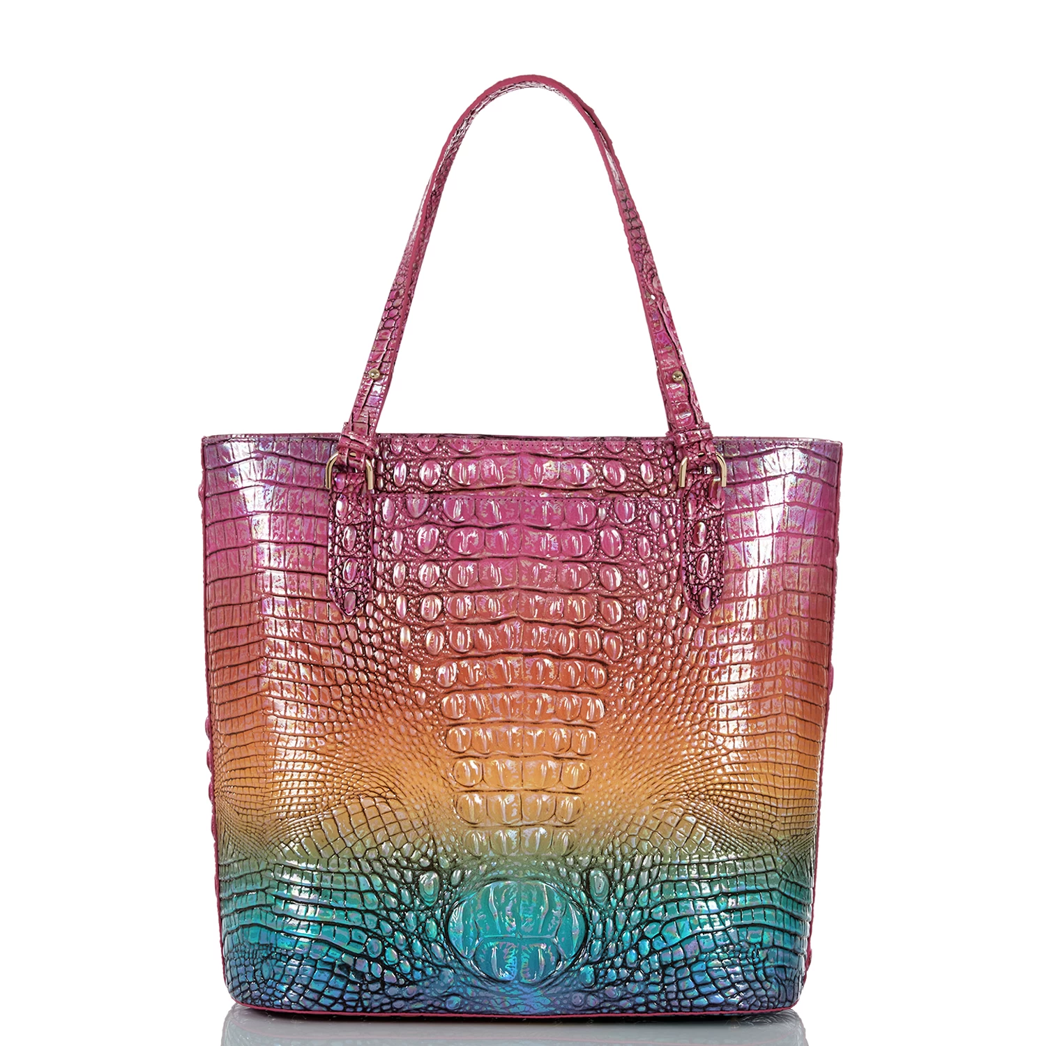Featured in Horizon Ombre Melbourne, a feel-good ombre inspired by the summer sunset. This skyline of colors features sunset yellow, clay red, dusty pink, violet quartz and deep teal. The iridescent foil finish gives this a brilliant glow that inspires. Made with genuine croc-embossed leather.