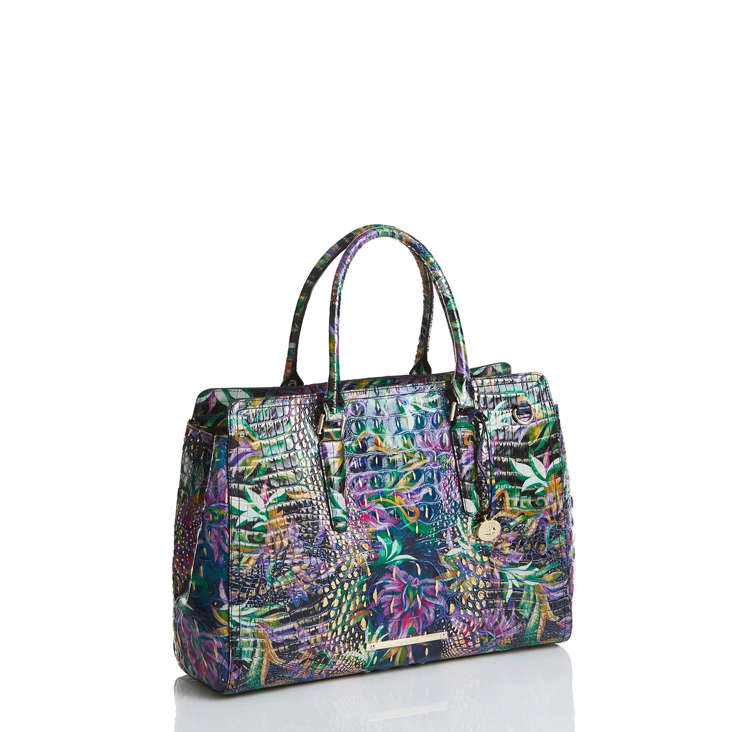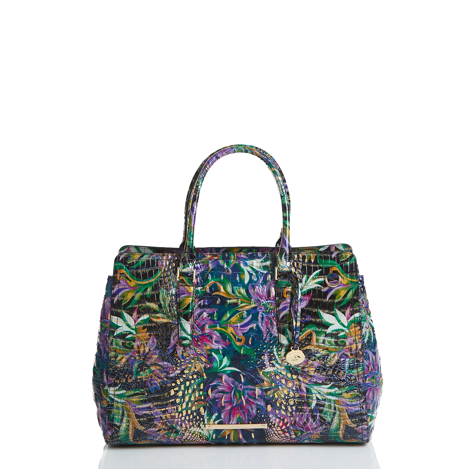 Featured in Visionary Melbourne, a bold, fresh new twist on romantic, feminine florals. This unique floral print combines all our favorite colors of the season, resulting in a telling, emotional work of art. The navy base offers effortless versatility and the gold foil tipping adds instant elevation. Made with genuine croc-embossed leather.