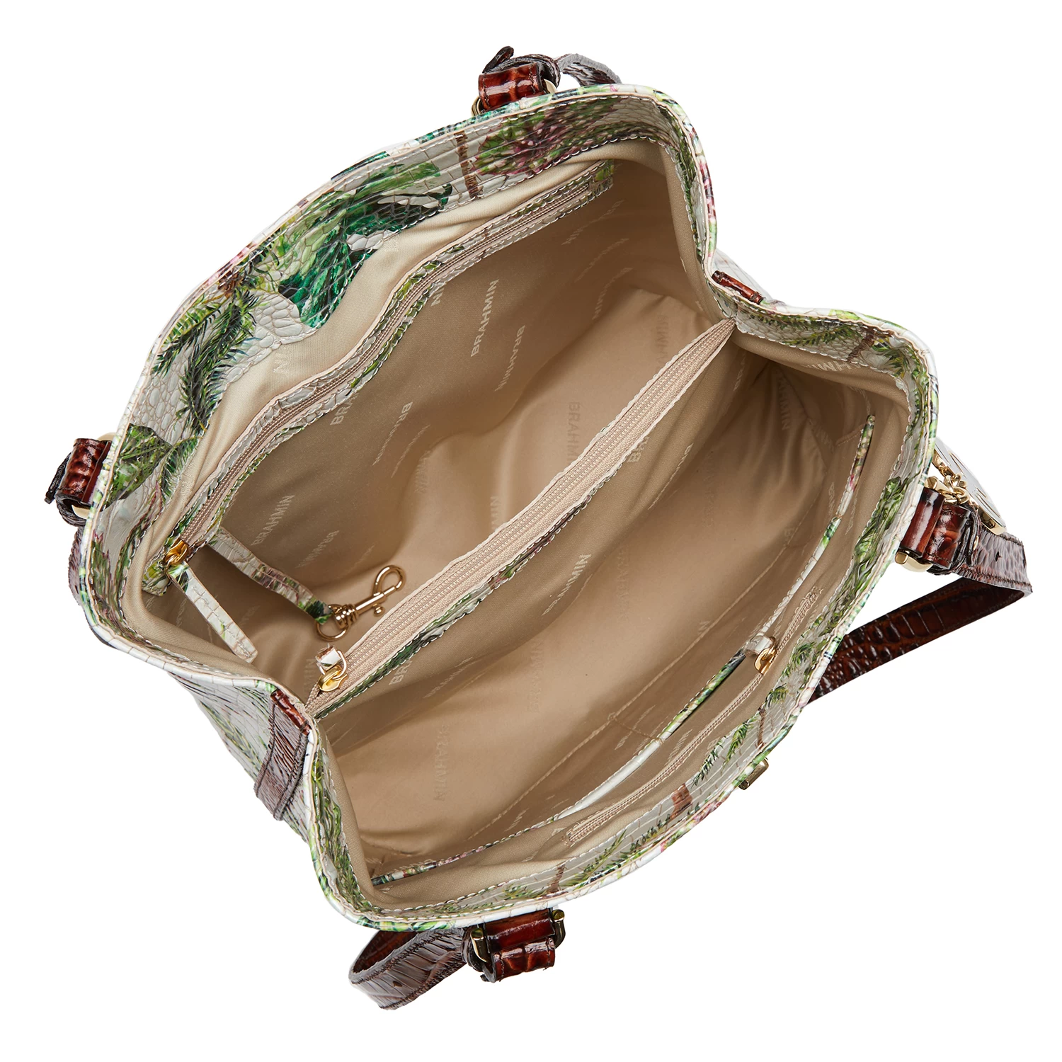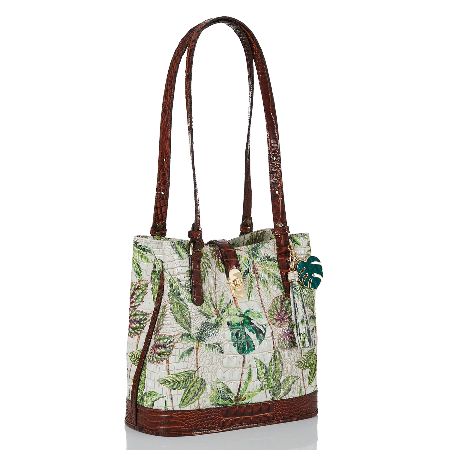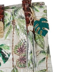 Featured in Pecan Retreat, an exclusive collector’s edition print that taps into the playful energy of the season. Retreat features an ivory base with jungle green tropical leaves and earthy brown palm trees for a print that feels like paradise. Inspired by escapism, this is whimsical as it is versatile. The print is paired with Pecan Melbourne for wearability. The custom resin palm charm is a rich green that elevates this essential. Made with genuine leather.