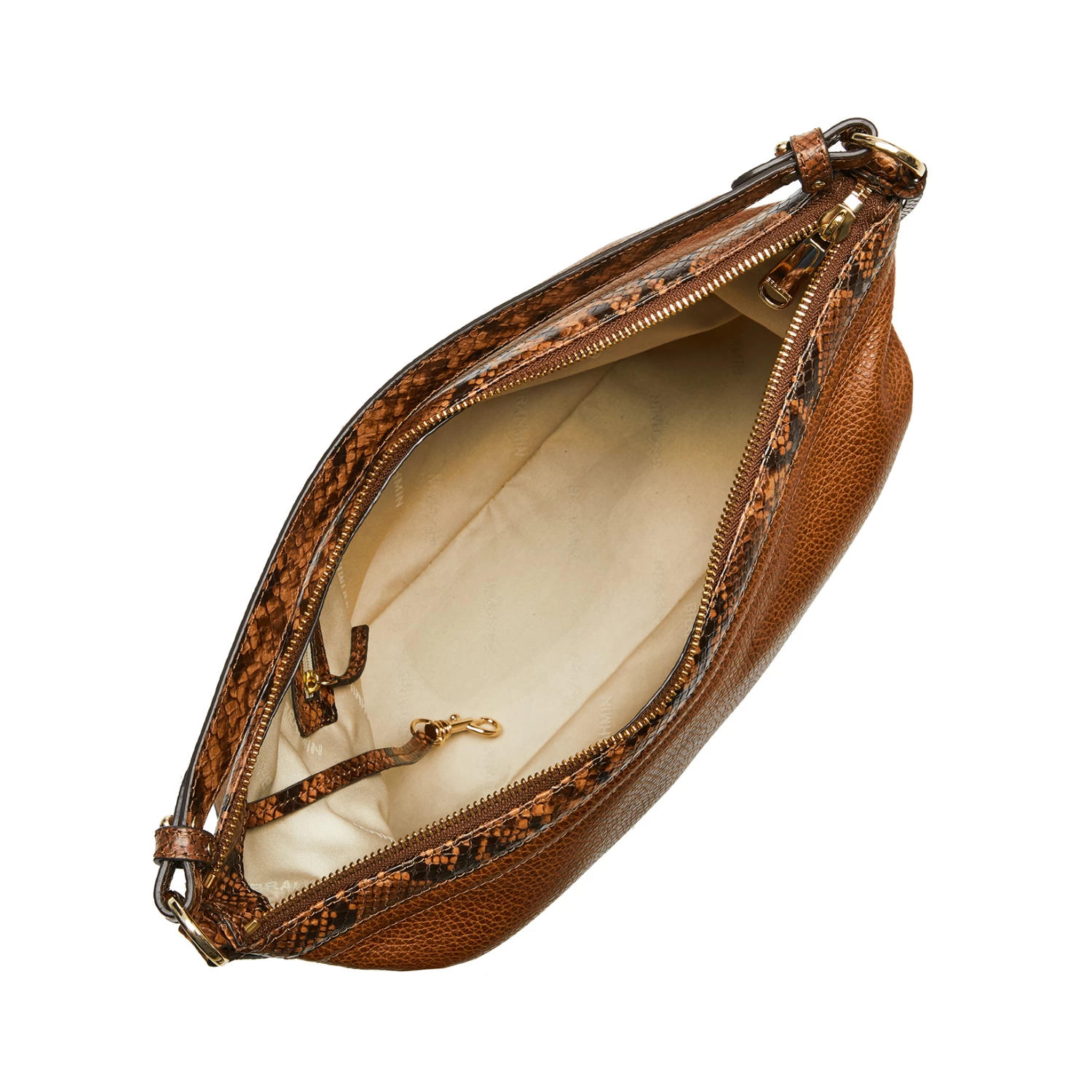 Featured in Cognac Saguaro, a fresh take on a classic. Warm, honey brown pebble leather gets trimmed with a rich snake texture for an unexpectedly versatile new combination. Elevated details like a resin inlay buckle and statement chain detailing add luxury to the look. Made with genuine leather.