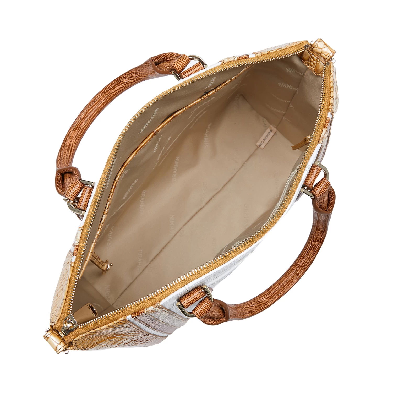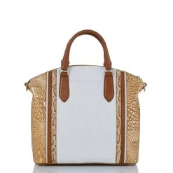 Featured in Dune Alamosa, an elevated new twist on a neutral. This unexpected combination is as versatile as it is chic. It combines the bright brilliance of Shell White with the warmth of Dune. The tobacco lizard trim adds dimension and texture. Made with genuine leather.