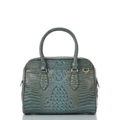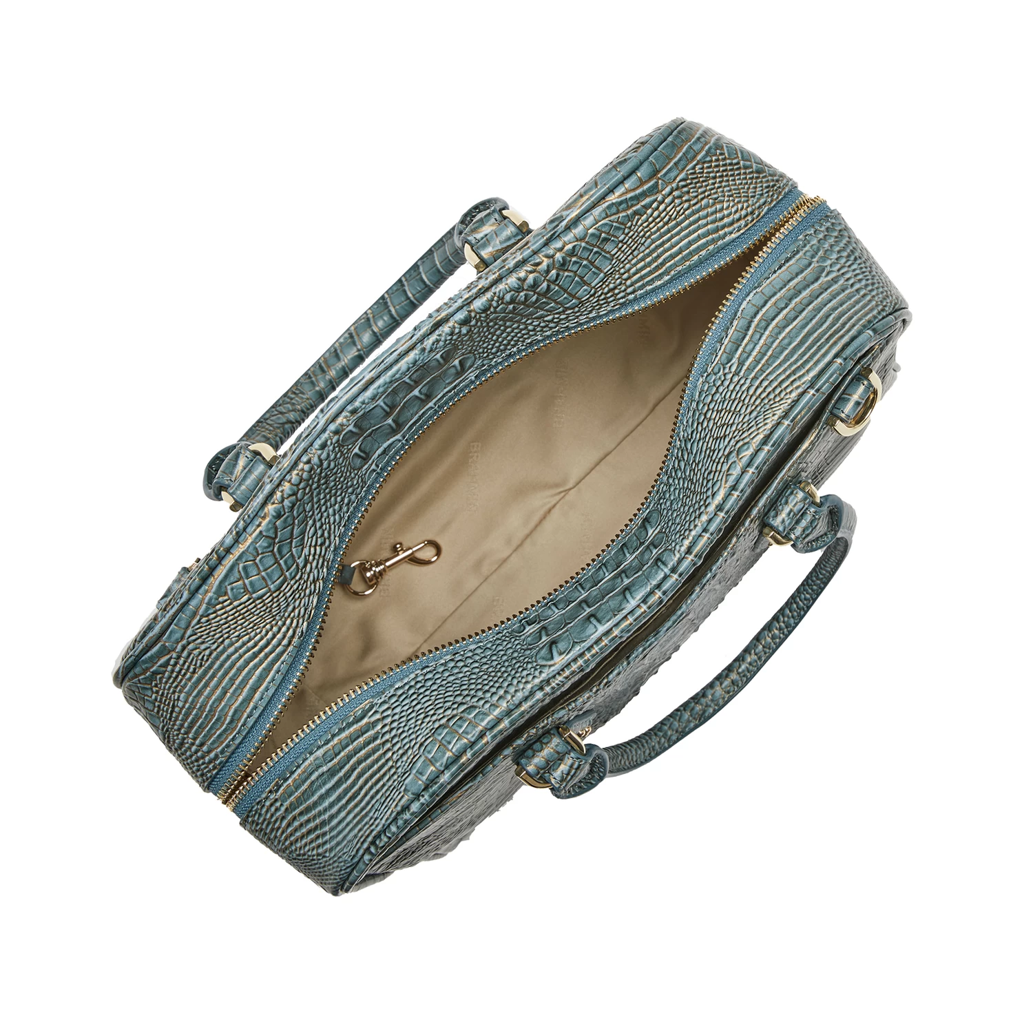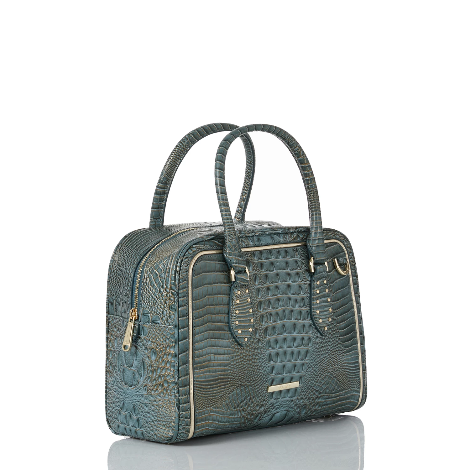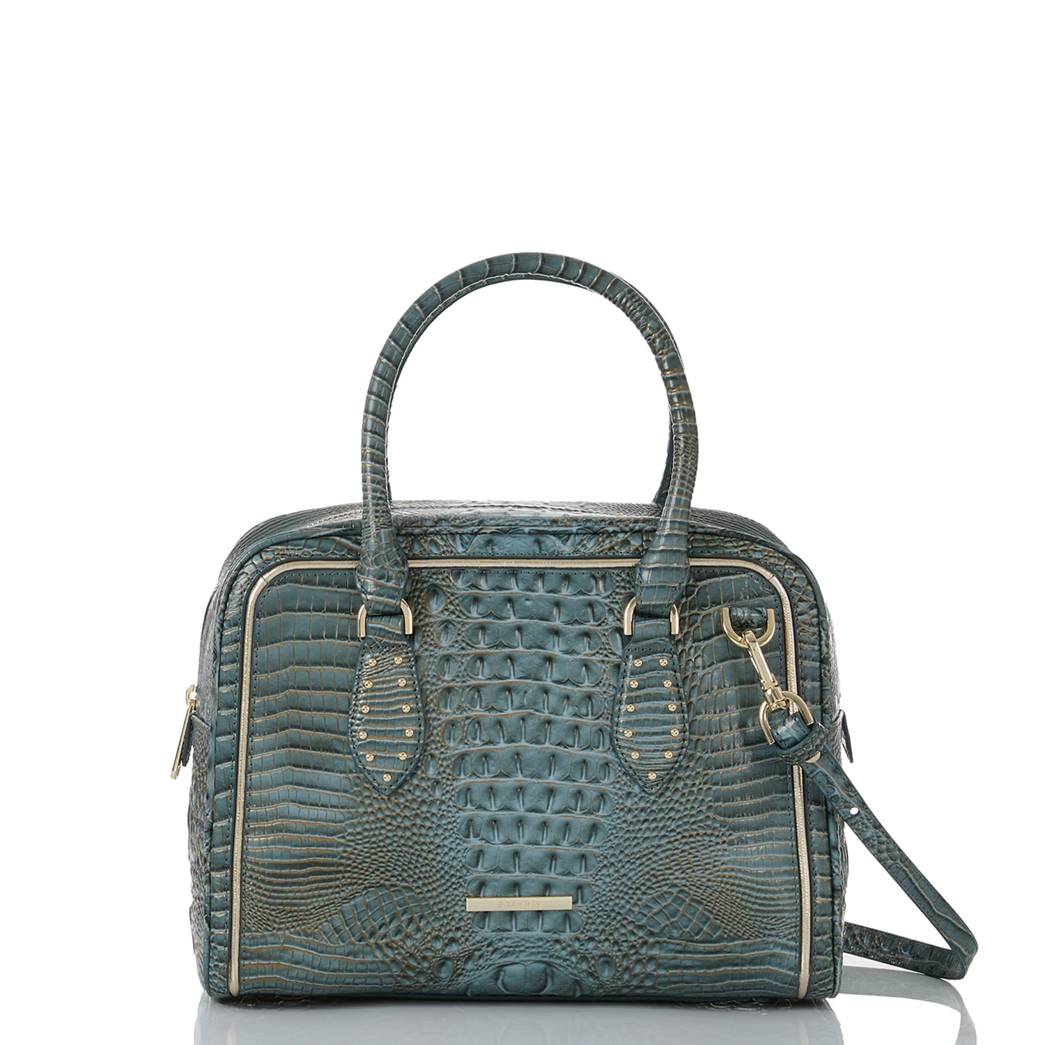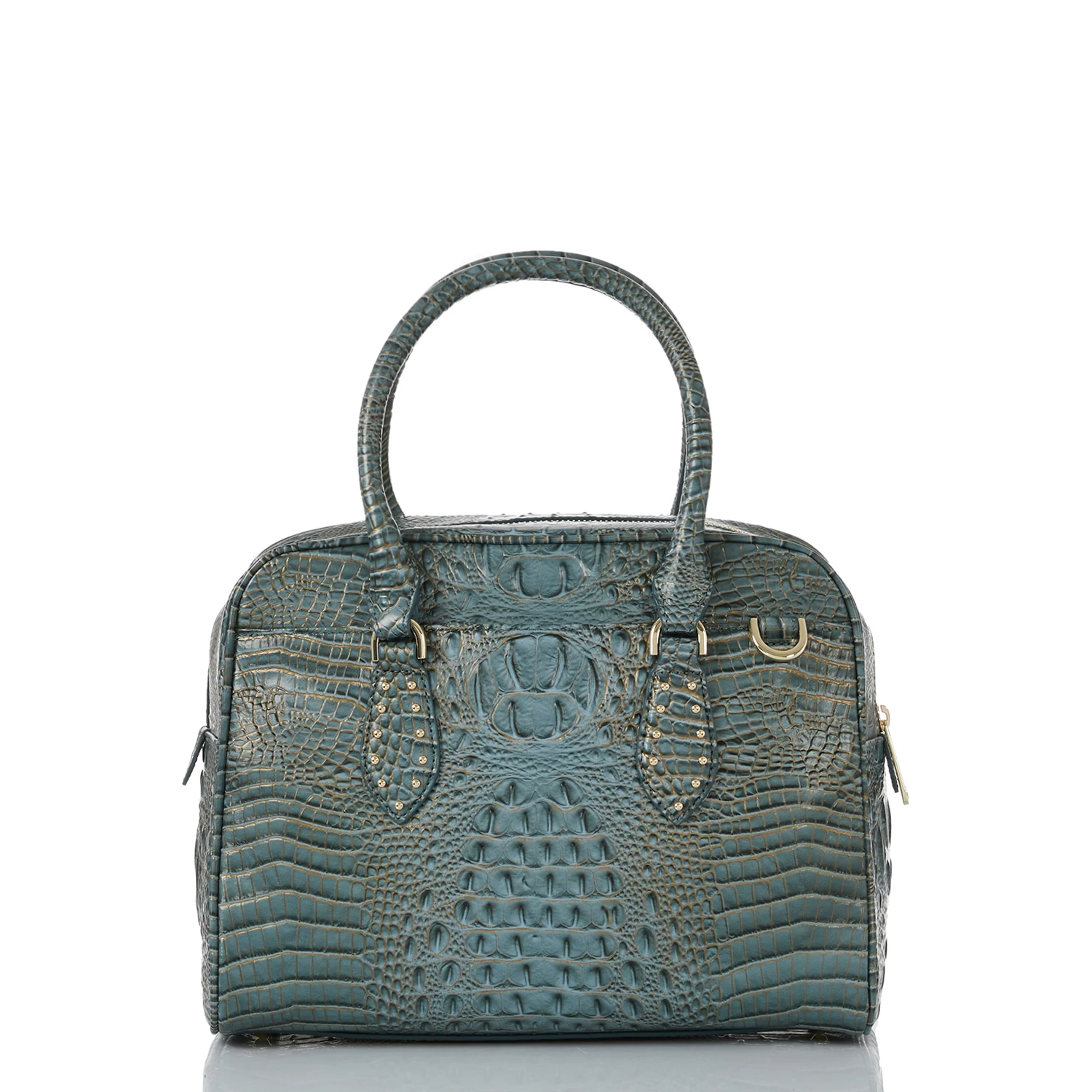 Featured in Slate Stratos, a wearable new slate blue. This mini Melbourne has a satin finish and the leather has a softer hand feel for a casual appeal. Slate Stratos is elevated with hints of gold shimmer and a smooth gold trim. The small stud detailing gives this a casual-cool ease that feels on-trend. Made with genuine leather.