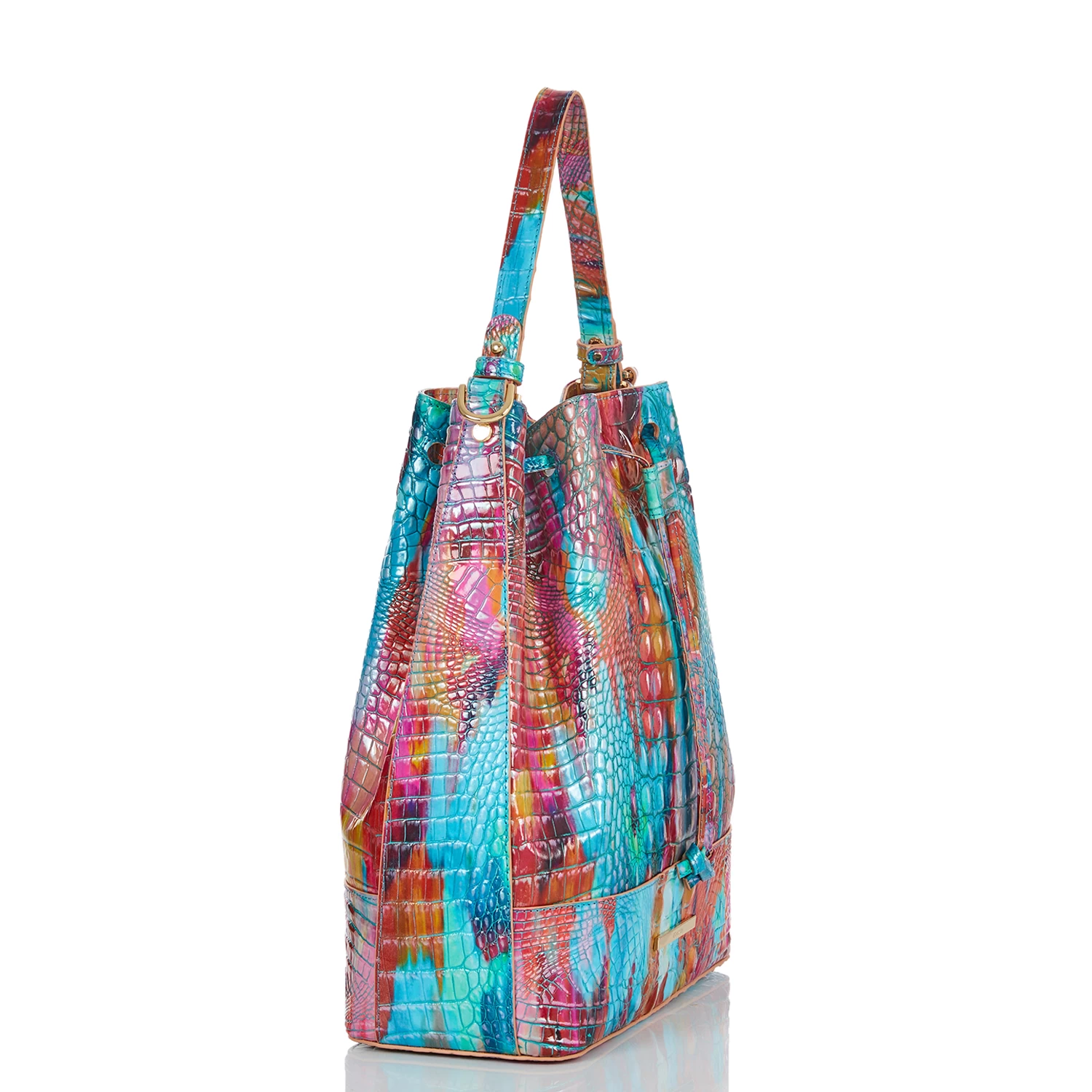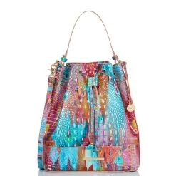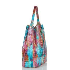 Featured in Fanciful Melbourne, an abstract print that brings the bold, exuberant energy of summer to life with saturated colors. The vibrant mix of electric turquoise and hot pink is a lively expression of creativity while the touch of silver instantly elevates. Made with genuine croc-embossed leather. Due to the nature of the materials used, each Brahmin product is one-of-a-kind. Variances in the pattern and texture of your bag may occur.