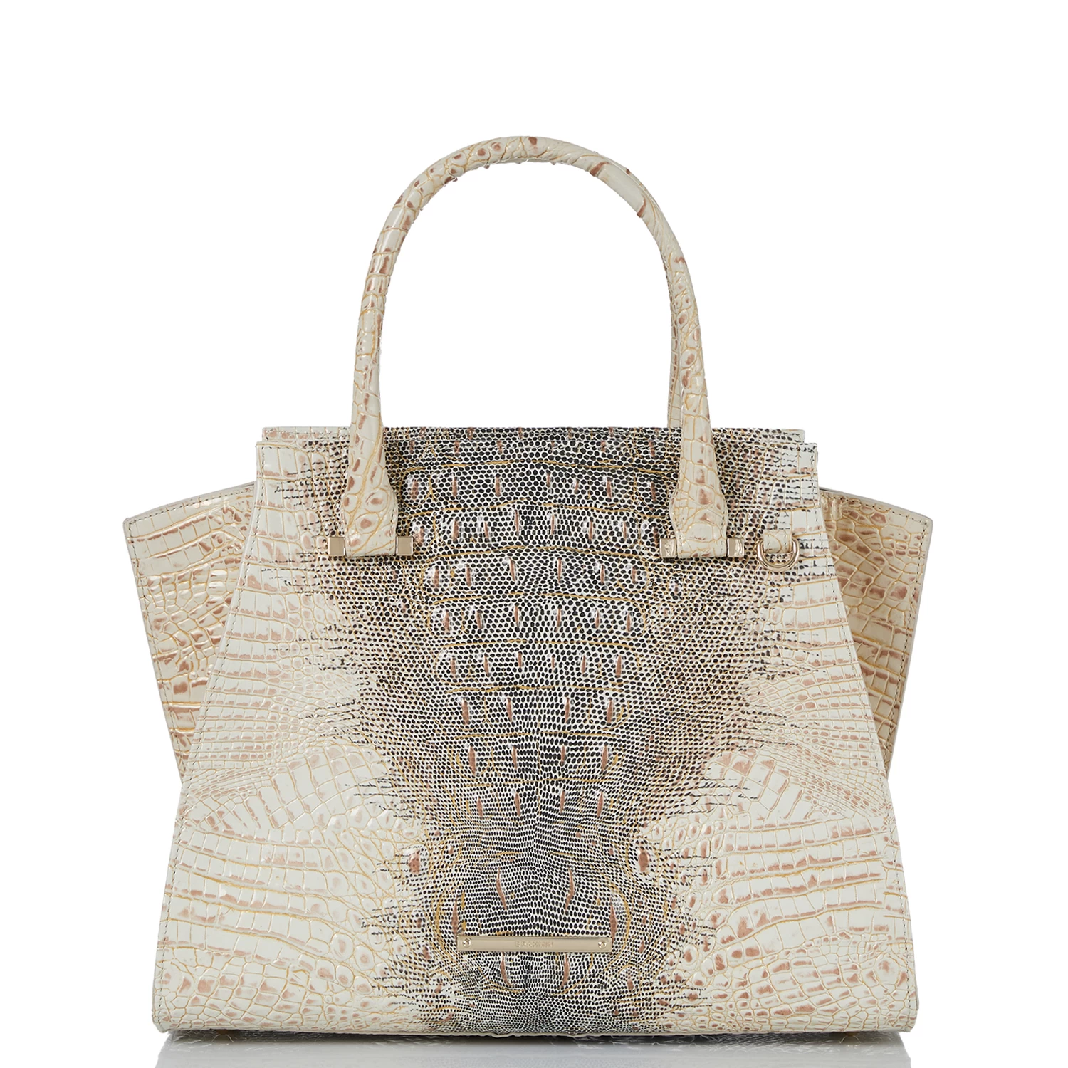 Featured in Ivory Iguana Melbourne, an elevated new neutral. This versatile warm cream features gold accents that lend luxury to the look. This also features hints of a lizard print for added dimension. Made with genuine croc-embossed leather.