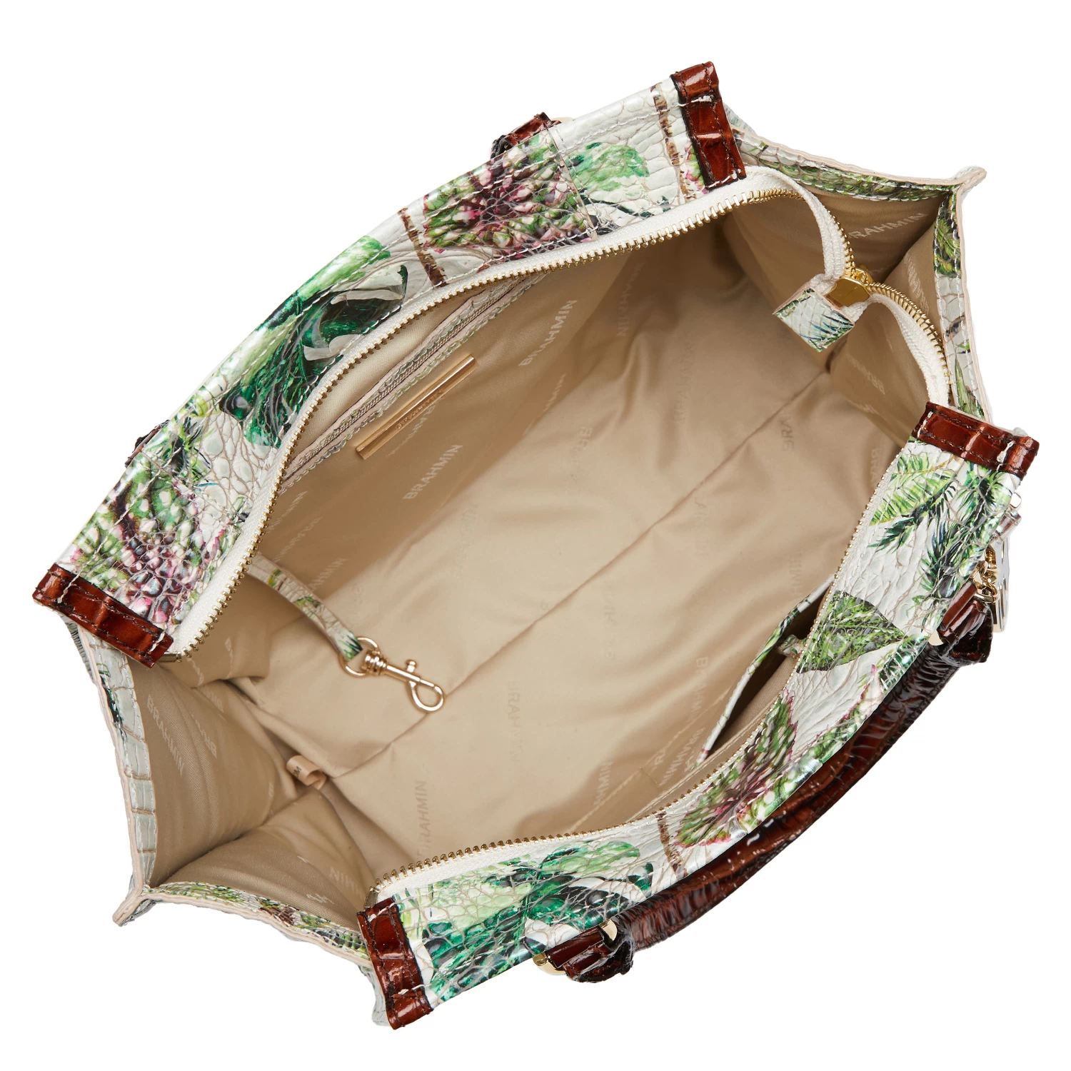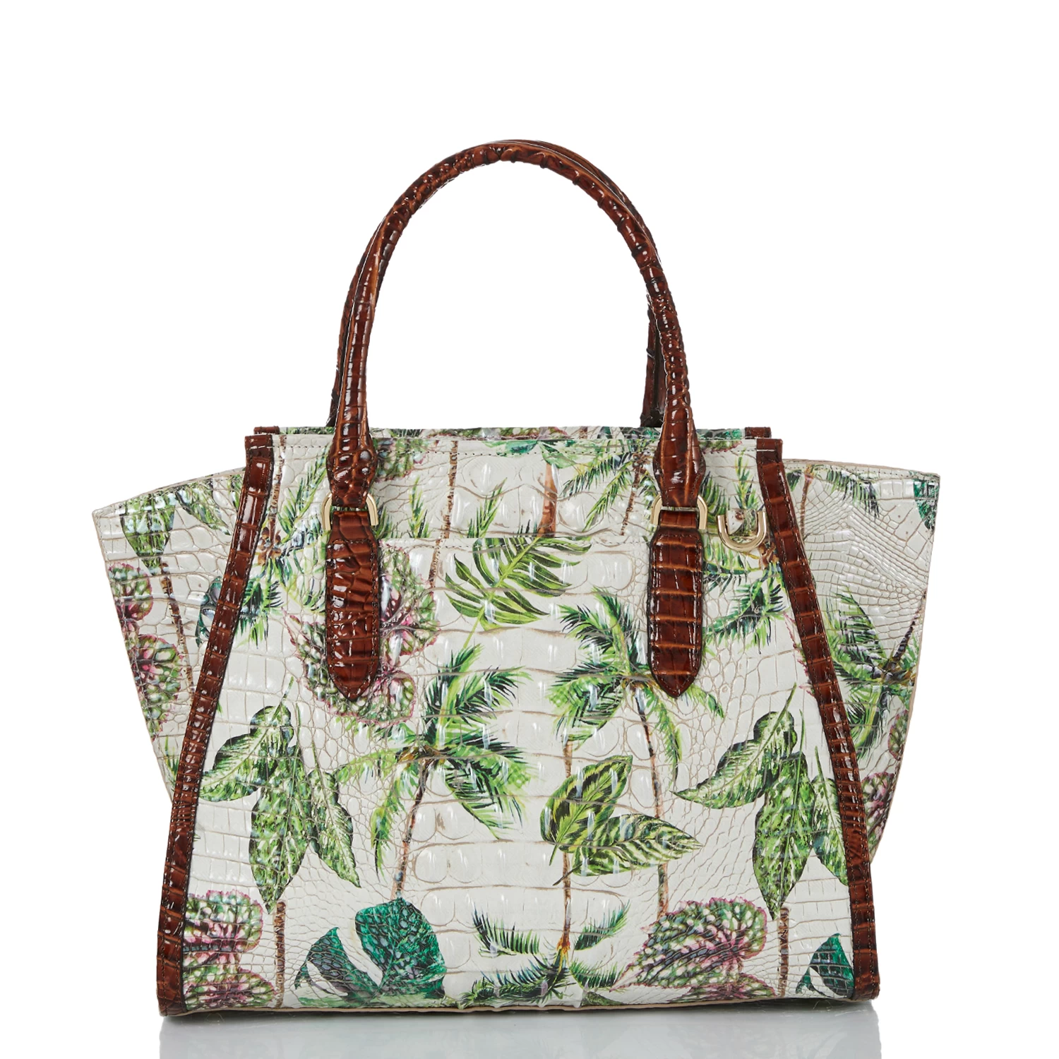 Featured in Pecan Retreat, an exclusive collector’s edition print that taps into the playful energy of the season. Retreat features an ivory base with jungle green tropical leaves and earthy brown palm trees for a print that feels like paradise. Inspired by escapism, this is whimsical as it is versatile. The print is paired with Pecan Melbourne for wearability. The custom resin palm charm is a rich green that elevates this essential. Made with genuine leather.