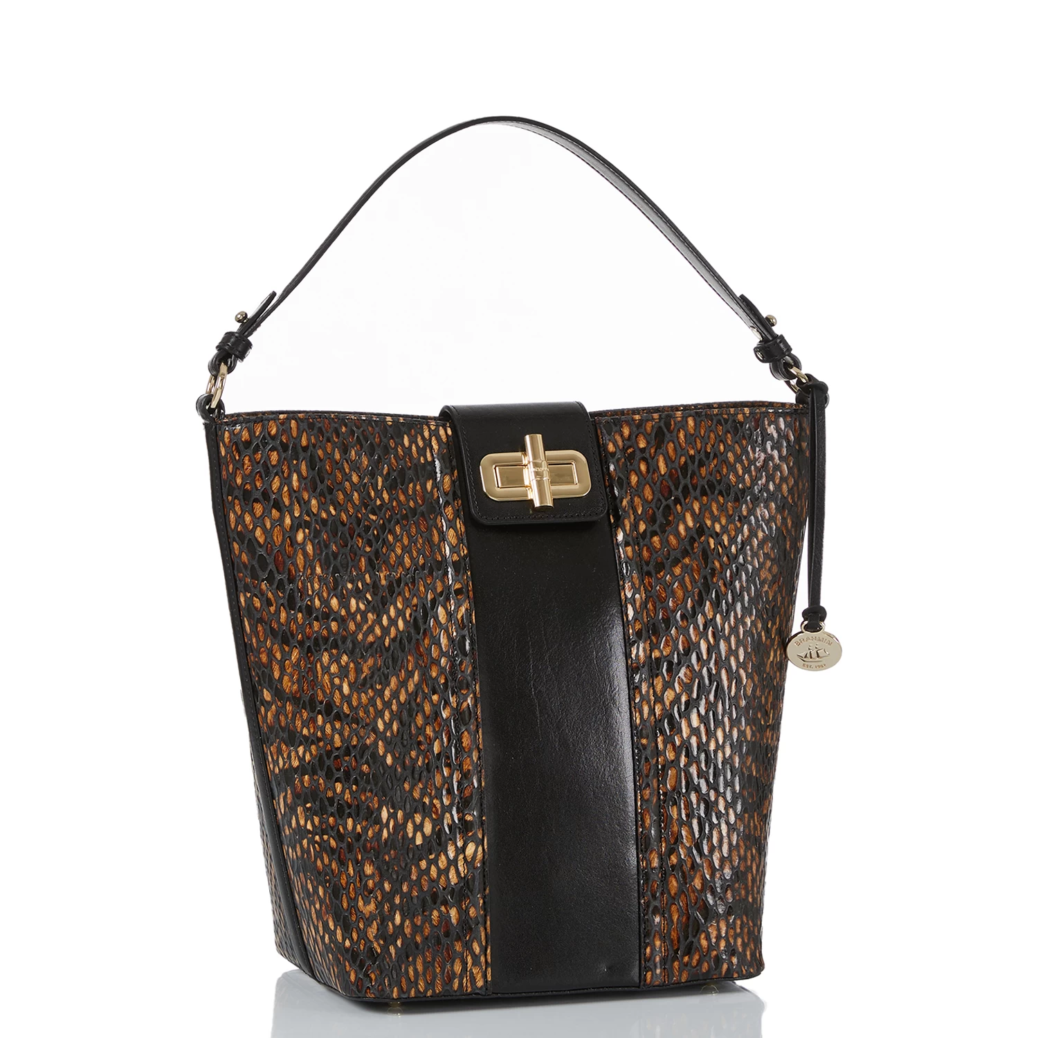 Featured in Cocoa Blanchard, an elevated animal print, featuring a rich tiger stripe on snake, paired with an Italian black smooth leather. It is detailed in a modern color block layout with elegant quilted details. Made with genuine leather.