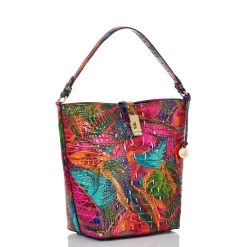 Featured in Lush Melbourne, a vibrant tropical print bursting with saturated colors that celebrate warmer weather. This whimsical tropical leaf print features rich orange, deep pink, and aqua blue with hints of cobalt to add depth and dimension. Made with genuine croc-embossed leather.