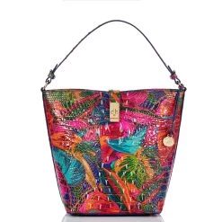 Featured in Lush Melbourne, a vibrant tropical print bursting with saturated colors that celebrate warmer weather. This whimsical tropical leaf print features rich orange, deep pink, and aqua blue with hints of cobalt to add depth and dimension. Made with genuine croc-embossed leather.