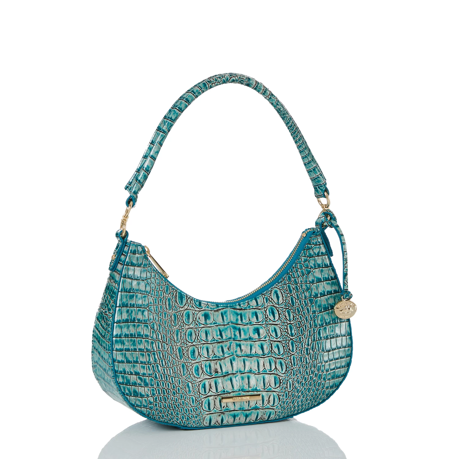 Featured in Mineral Blue Melbourne, a fresh, calming mix of color that instantly captivates. This imaginative combination of color was inspired by the hues, texture, and natural shine found in turquoise stones. Made with genuine croc-embossed leather.