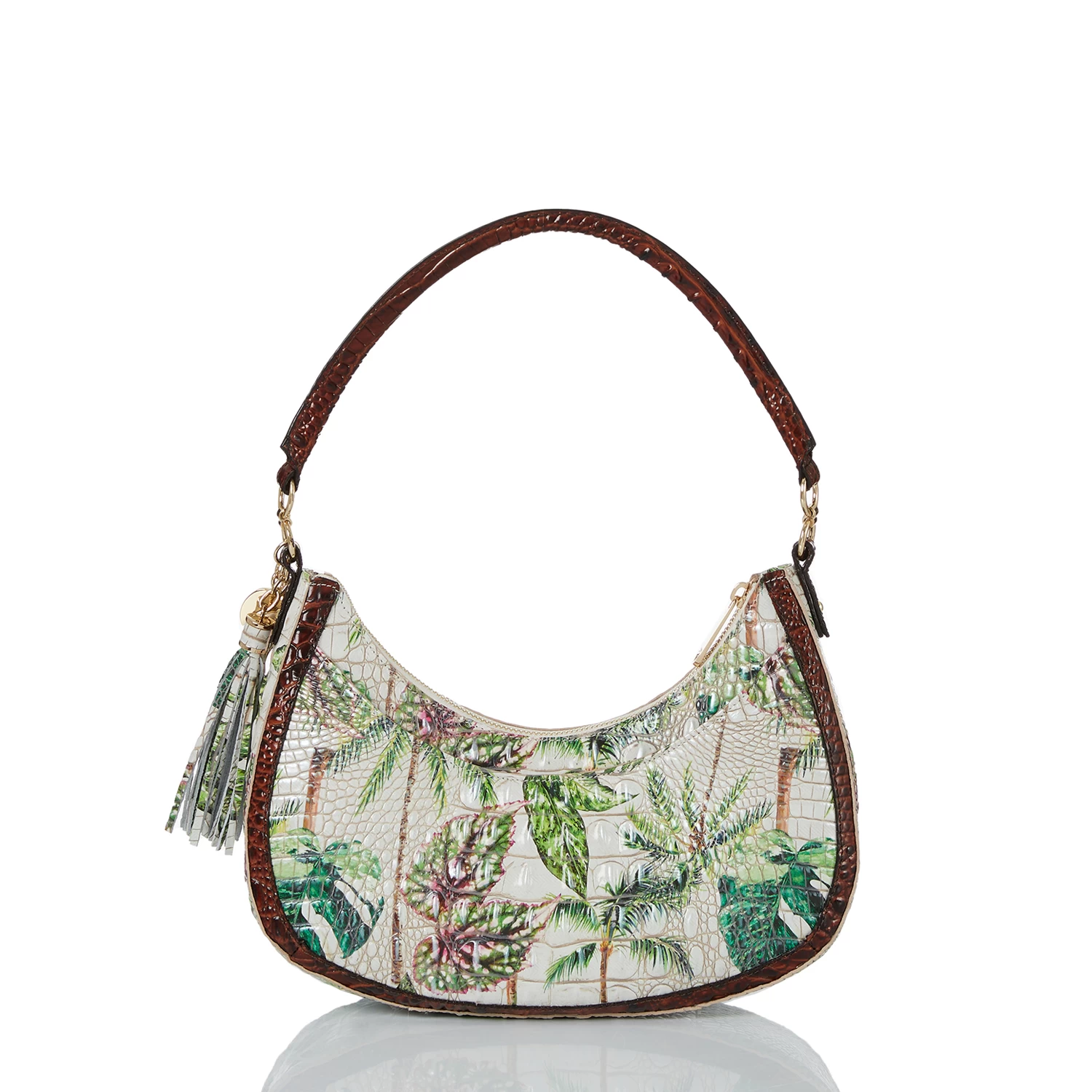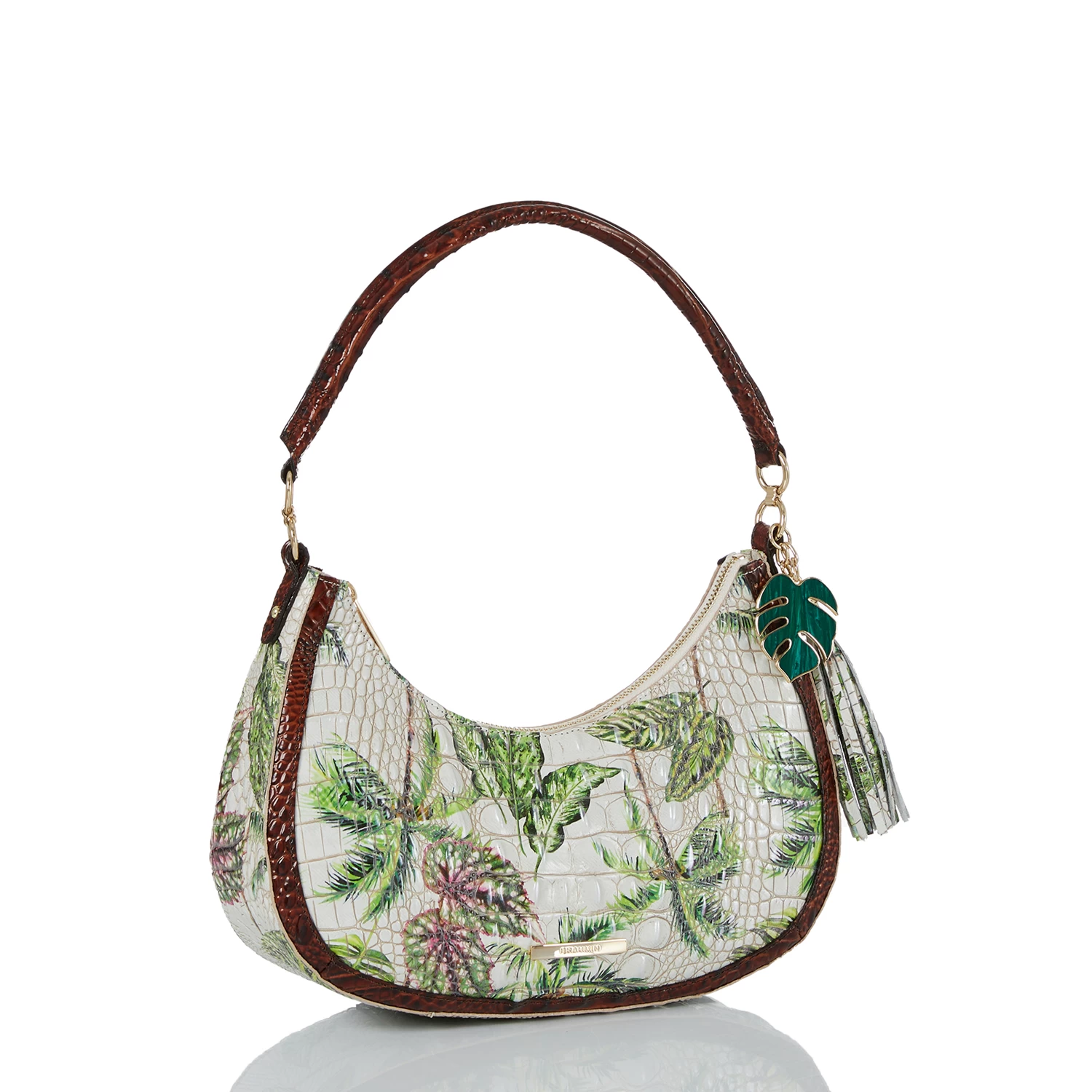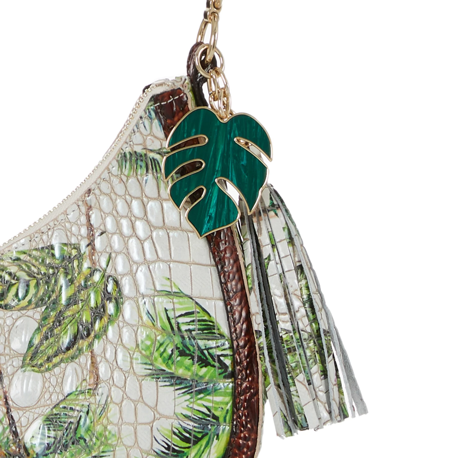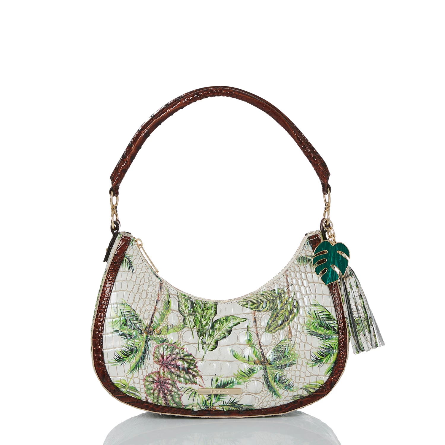 Featured in Pecan Retreat, an exclusive collector’s edition print that taps into the playful energy of the season. Retreat features an ivory base with jungle green tropical leaves and earthy brown palm trees for a print that feels like paradise. Inspired by escapism, this is whimsical as it is versatile. The print is paired with Pecan Melbourne for wearability. The custom resin palm charm is a rich green that elevates this essential. Made with genuine leather.