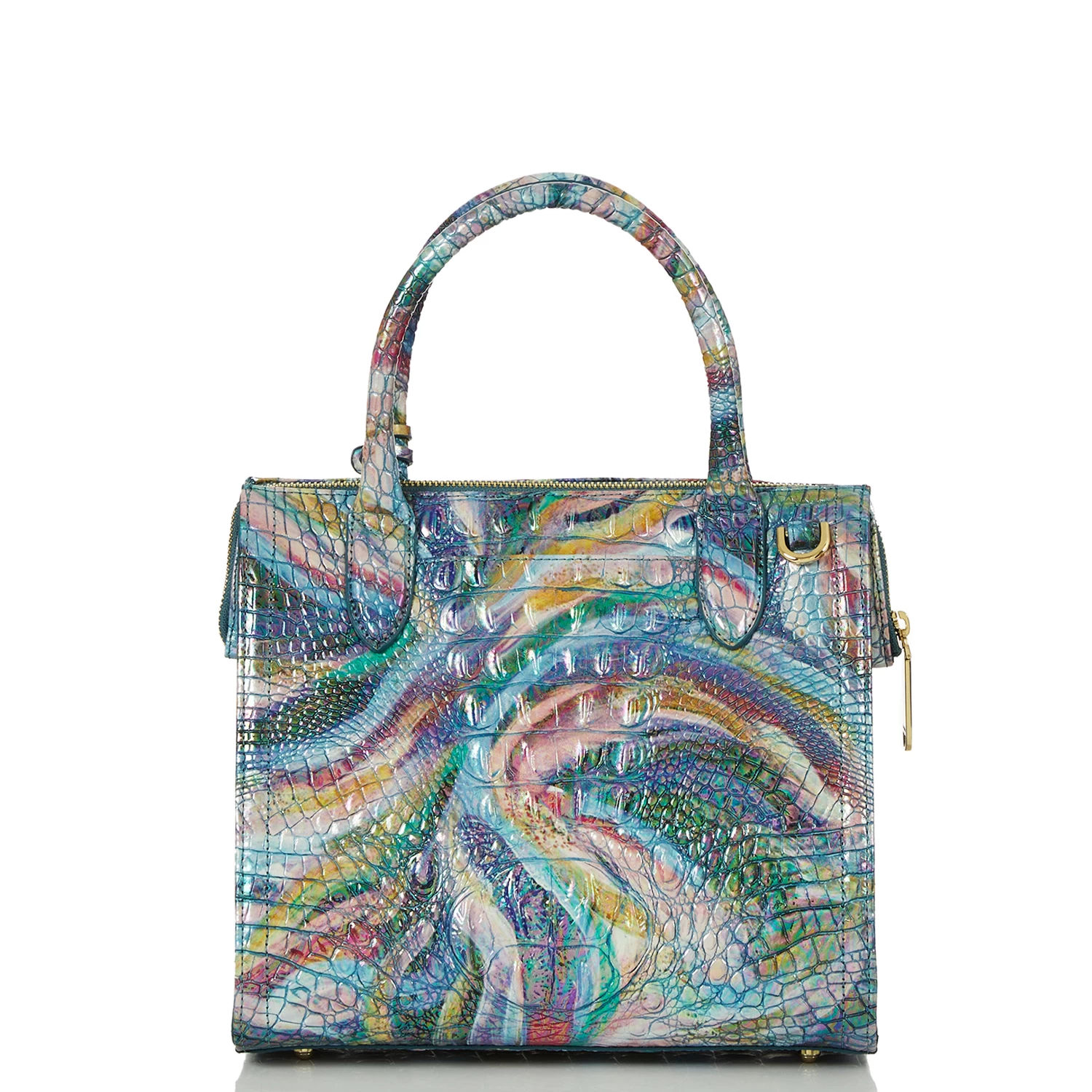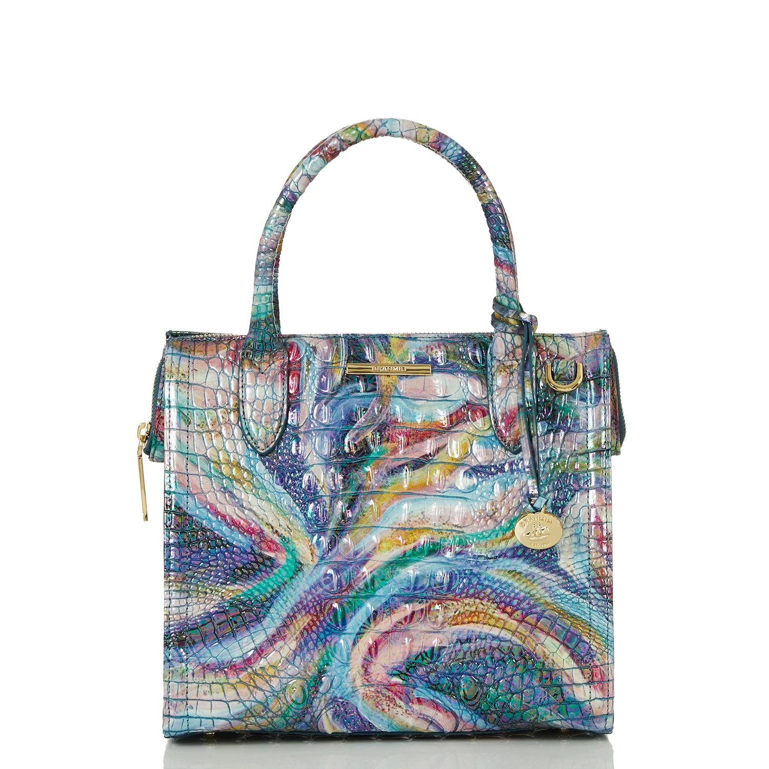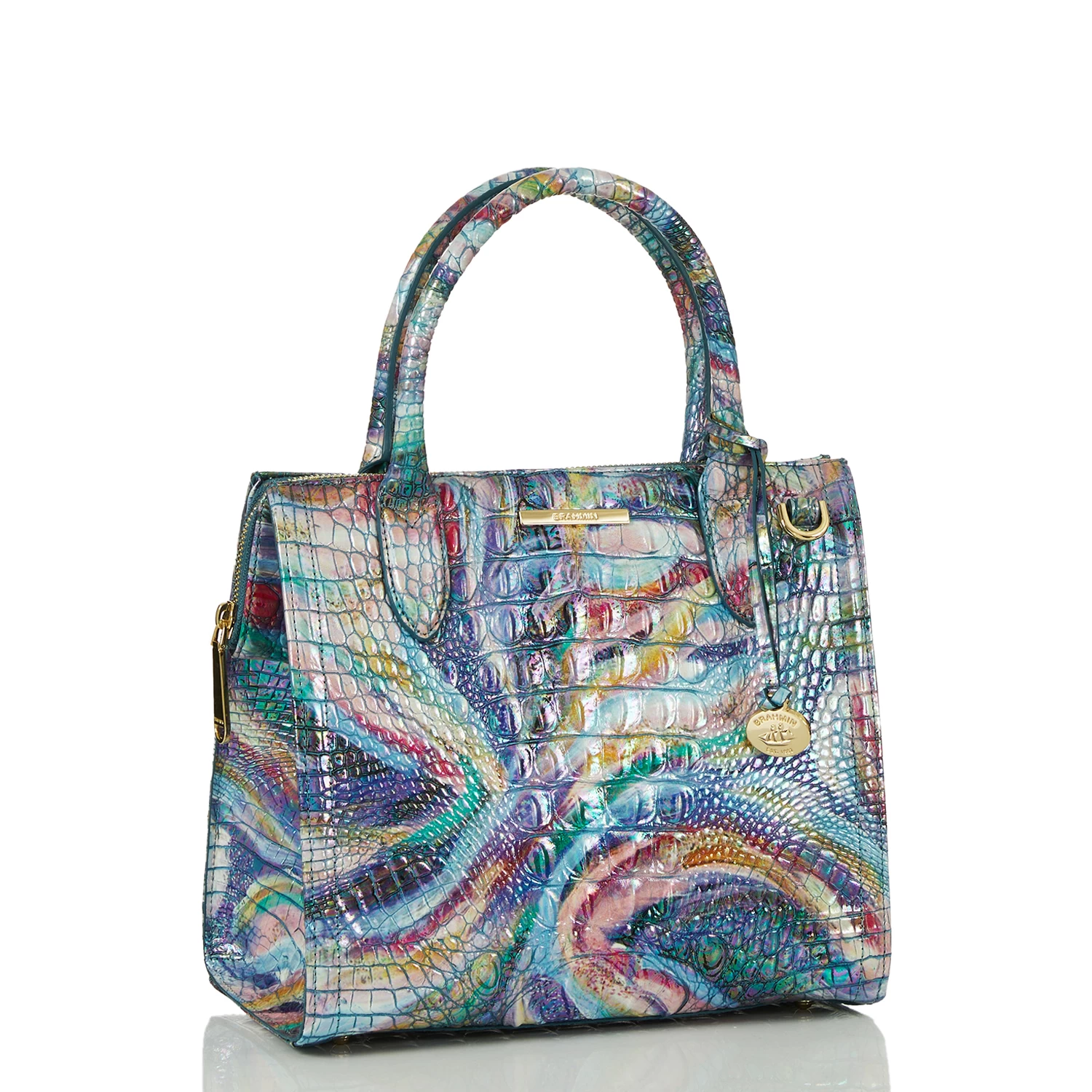 Featured in Elope Melbourne, a creative combination of color designed to ignite the imagination. Enter a world of whimsy with this playful print that has iridescent shine bringing a glow to the season. Made with genuine croc-embossed leather.