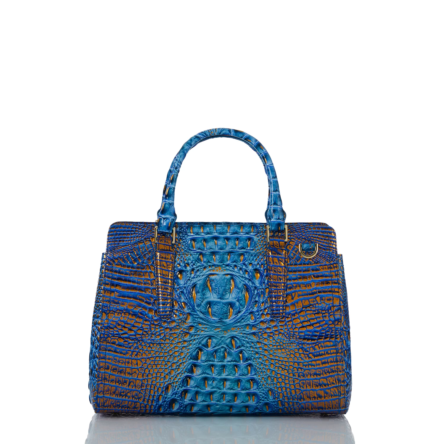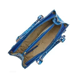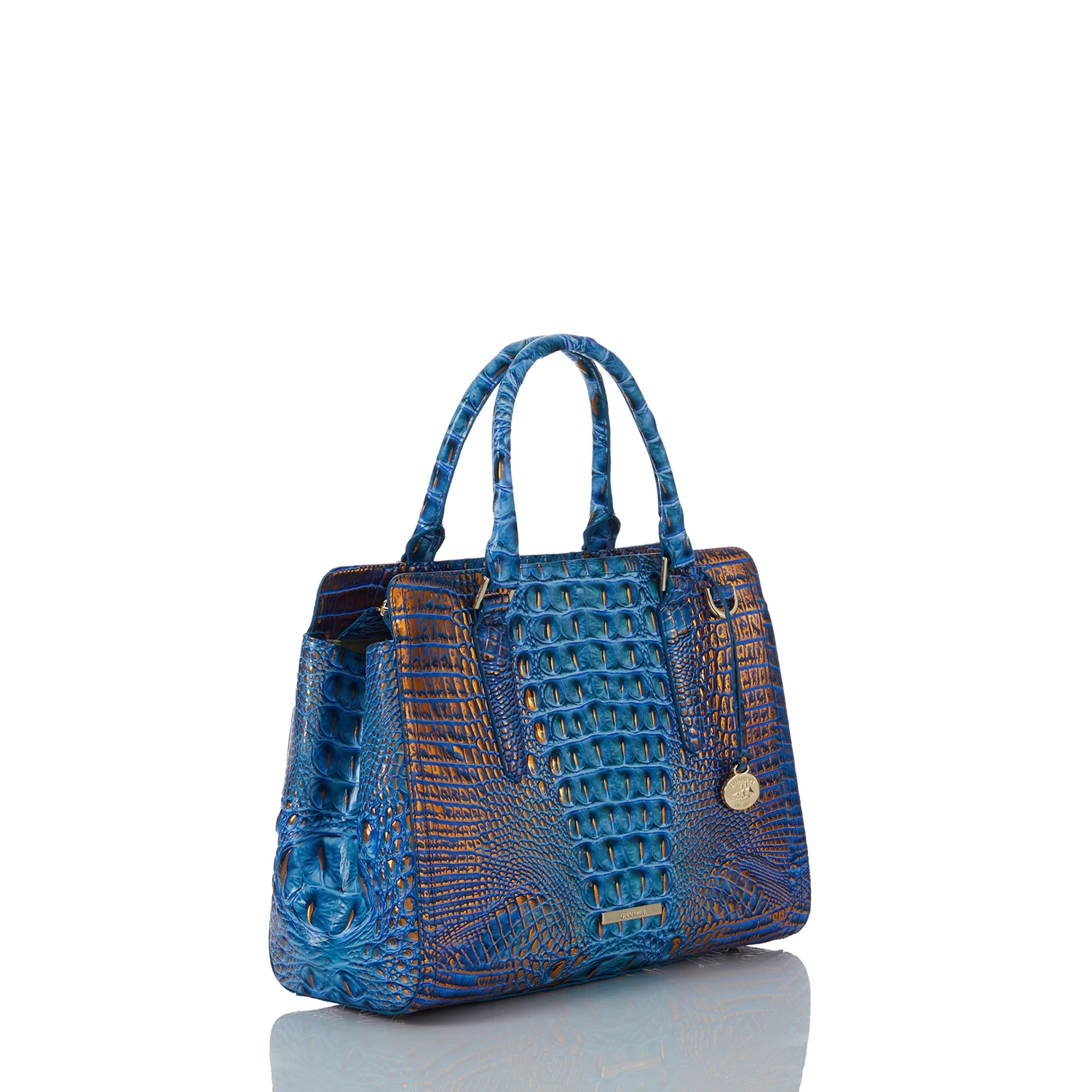 Featured in Deep Azure Melbourne, a saturated, dynamic blue. This deep, dazzling blue is accented with a copper metallic shimmer that brings eye-catching shine to warmer weather. Made with genuine croc-embossed leather.