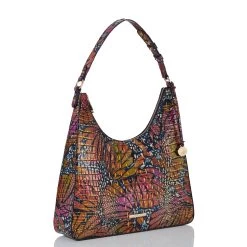 Featured in Flutter Melbourne, a whimsical, imaginative print that will instantly brighten your mood. The combination of bold and warm colors captures the playfulness of the season while the navy base allows for effortless versatility. Made with genuine croc-embossed leather.