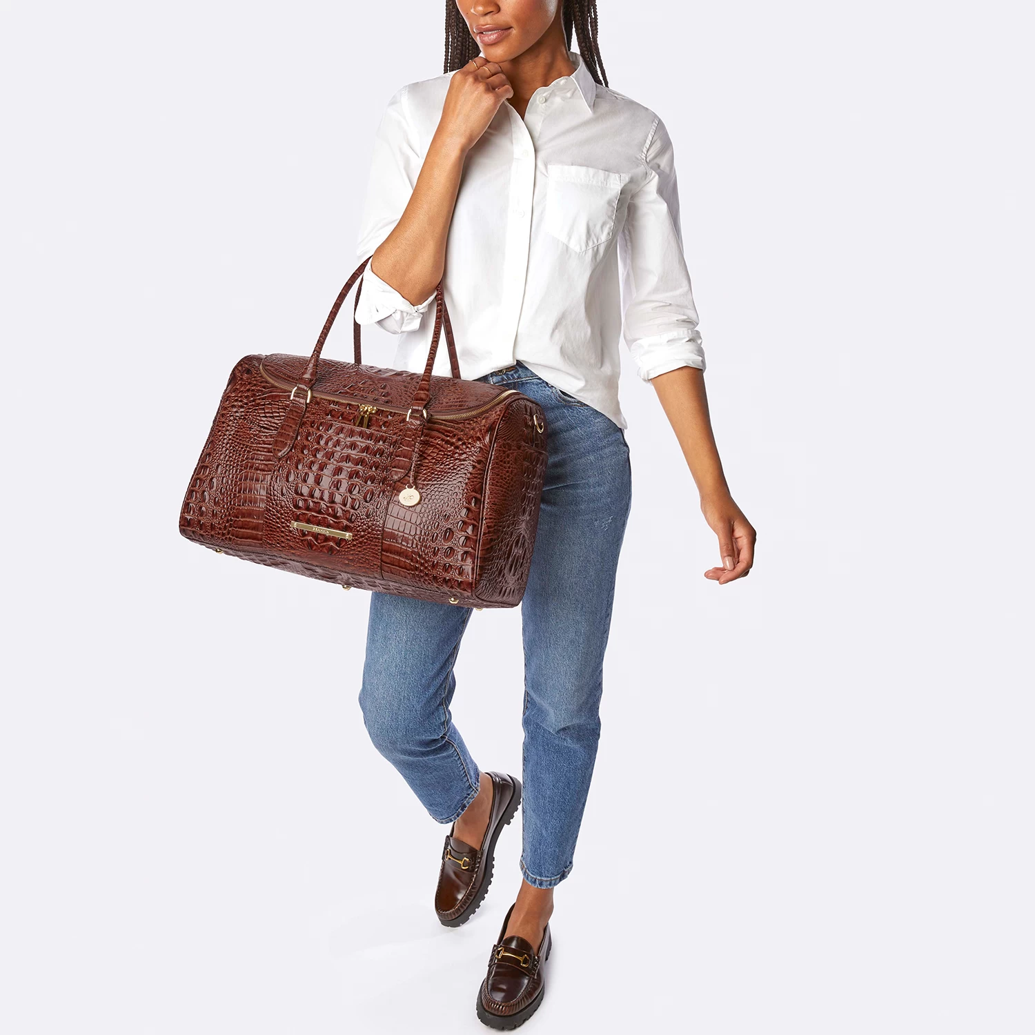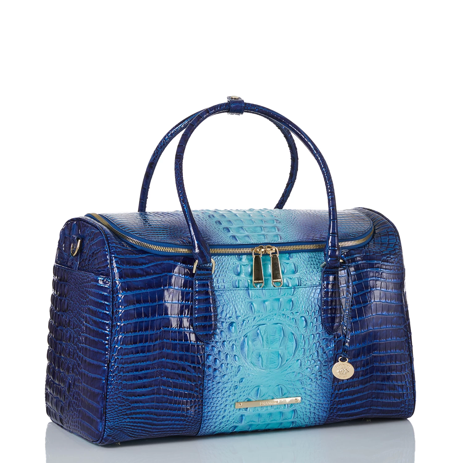 Featured in Affinity Ombre Melbourne, a striking ombre that showcases a splash of saturated aquamarine and cerulean blue. The paradise inspired palette brings a playful brightness into the season. Made with genuine croc-embossed leather.