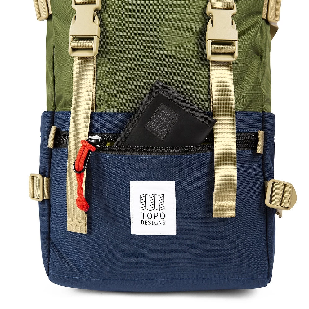 - Large zippered top flap pocket