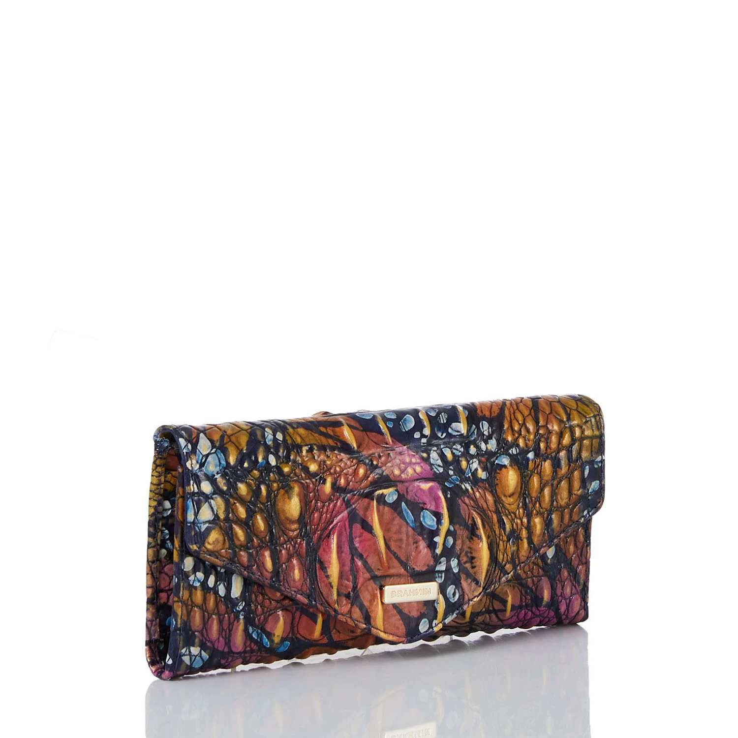 Featured in Flutter Melbourne, a whimsical, imaginative print that will instantly brighten your mood. The combination of bold and warm colors captures the playfulness of the season while the navy base allows for effortless versatility. Made with genuine croc-embossed leather.